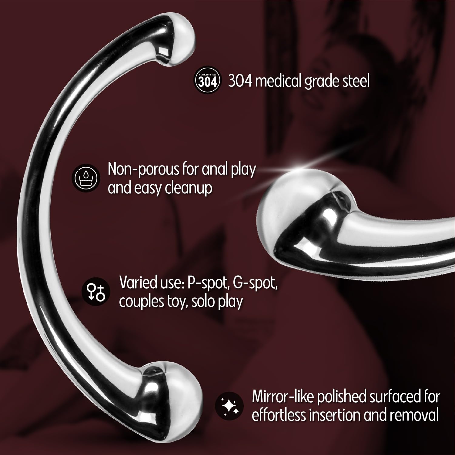 Elevate your pleasure with our exquisite Stainless Steel Dildo, the ultimate sex toys. It is a masterpiece of intimate engineering for adult toys. This luxurious dildo is crafted from 304 medical-grade stainless steel, ensuring the highest standard of safety and quality for your peace of mind. It is perfect for sex toys for men or male sex toys. Its solid construction guarantees durability, designed to last a lifetime of passion. Each dildo sex toy comes discreetly packaged, maintaining your privacy from purchase to play. The non-porous, medical grade steel promises a body-safe experience. Its ease of cleaning and medical grade non absorbing steel not only upholds the highest hygiene standards but also offers convenience, allowing you more time to indulge in your desires for an anal plug and adult toy. The substantial weight of the solid stainless steel intensifies every moment, ensuring a deeply satisfying sensation for a prostate massager. This piece is thoughtfully curved, catering to both ergonomic handling and optimal reach, targeting the prostate massage as an anal dildo (P-spot), vaginal G-spot massage and anal play with precision. Whether used for anal play, during sex, or as a couples sex toys, it offers versatile stimulation and boundless pleasure. Included with your purchase is a high-quality storage box, providing a secure and elegant home for your toy when not in use. The dual-headed design allows for temperature play, inviting you to explore the thrilling contrast between warm and cool sensations. Designed and an adult sex toys it can be a couples sex toy, sex toys for men and women alike, this versatile dildo is a potent tool for exploring the depths of your pleasure, whether you 're engaging in solo play or with a partner. Discover the ultimate in luxury and sensation with our dual head Stainless Steel Dildo, where unparalleled craftsmanship meets intimate exploration.