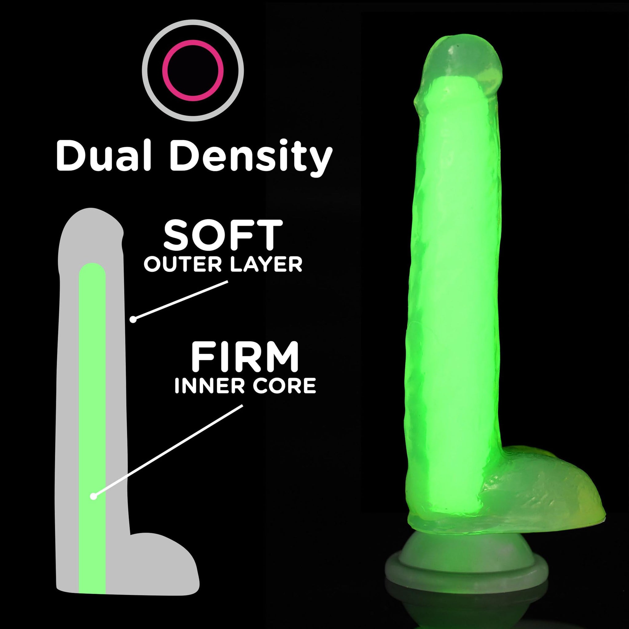 Features Dual Density Design Glows In The Dark Extreme Flexibility Made With 100% Body Safe Silicone Super Strong Suction Cup Sticks To Almost Any Flat Surface Harness Compatible Easy To Clean Hypoallergenic Non-Porous Product Details Length: 8.2'' Insertable Length: 6.5'' Widest Insertable Diameter: 1.5'' Weight: 9.24 Oz.