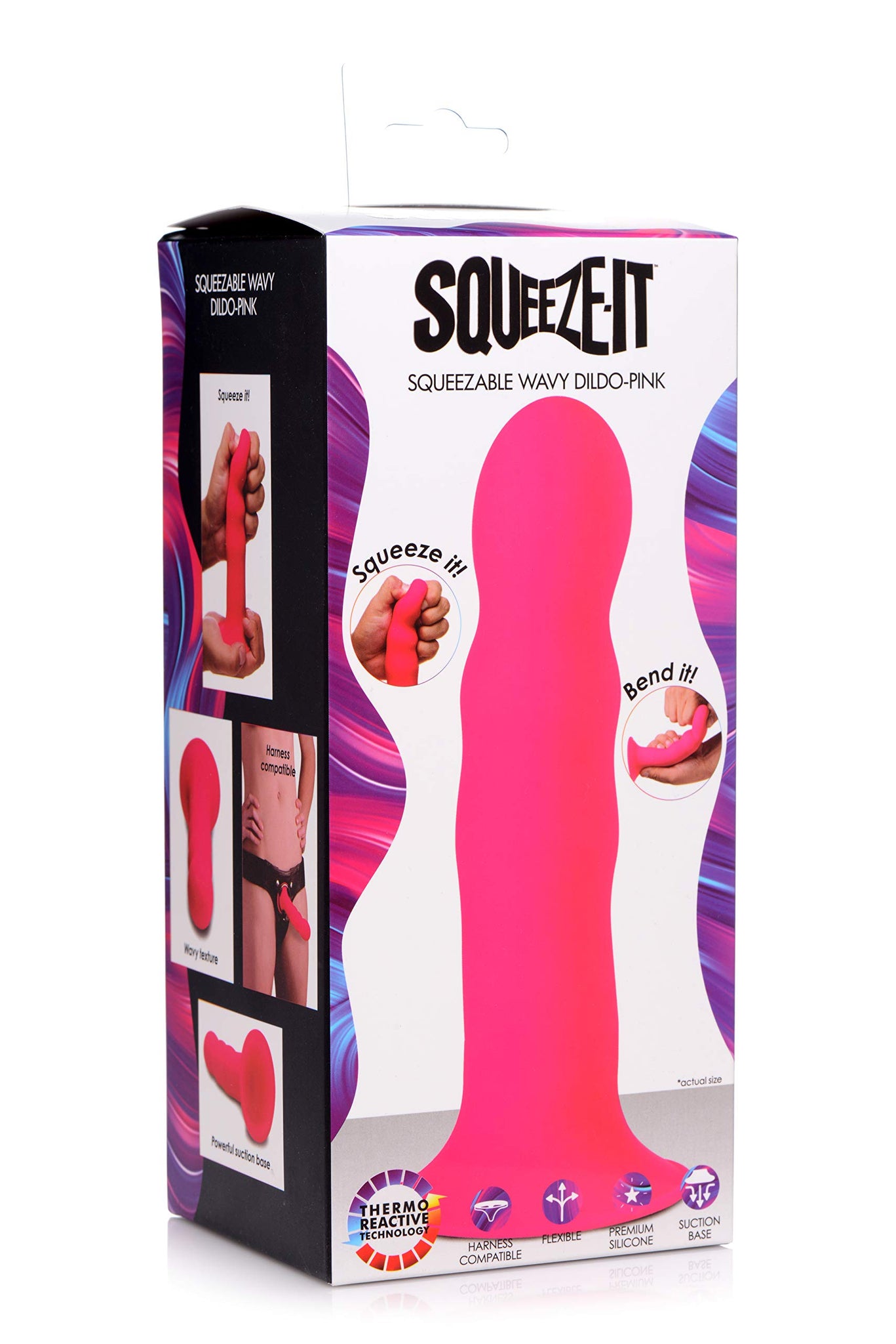 Q: What color is the Squeeze-It Squeezable Wavy Dildo?A: The Squeeze-It Dildo is available in a vibrant pink color.