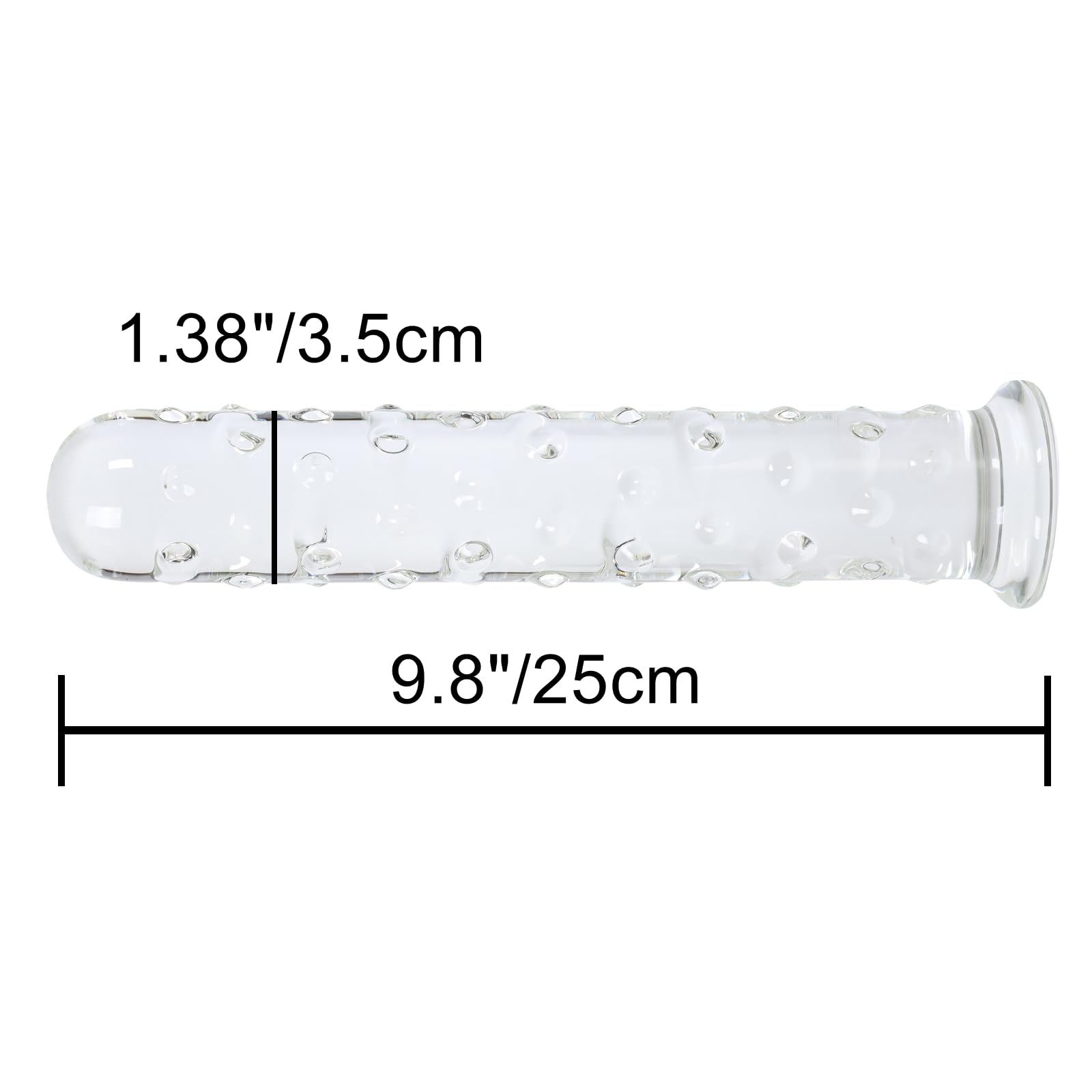 Q: What are the dimensions of this glass dildo?A: The total length of the dildo is 9.8 inches (25 cm) with the widest diameter measuring 1.38 inches (3.5 cm).