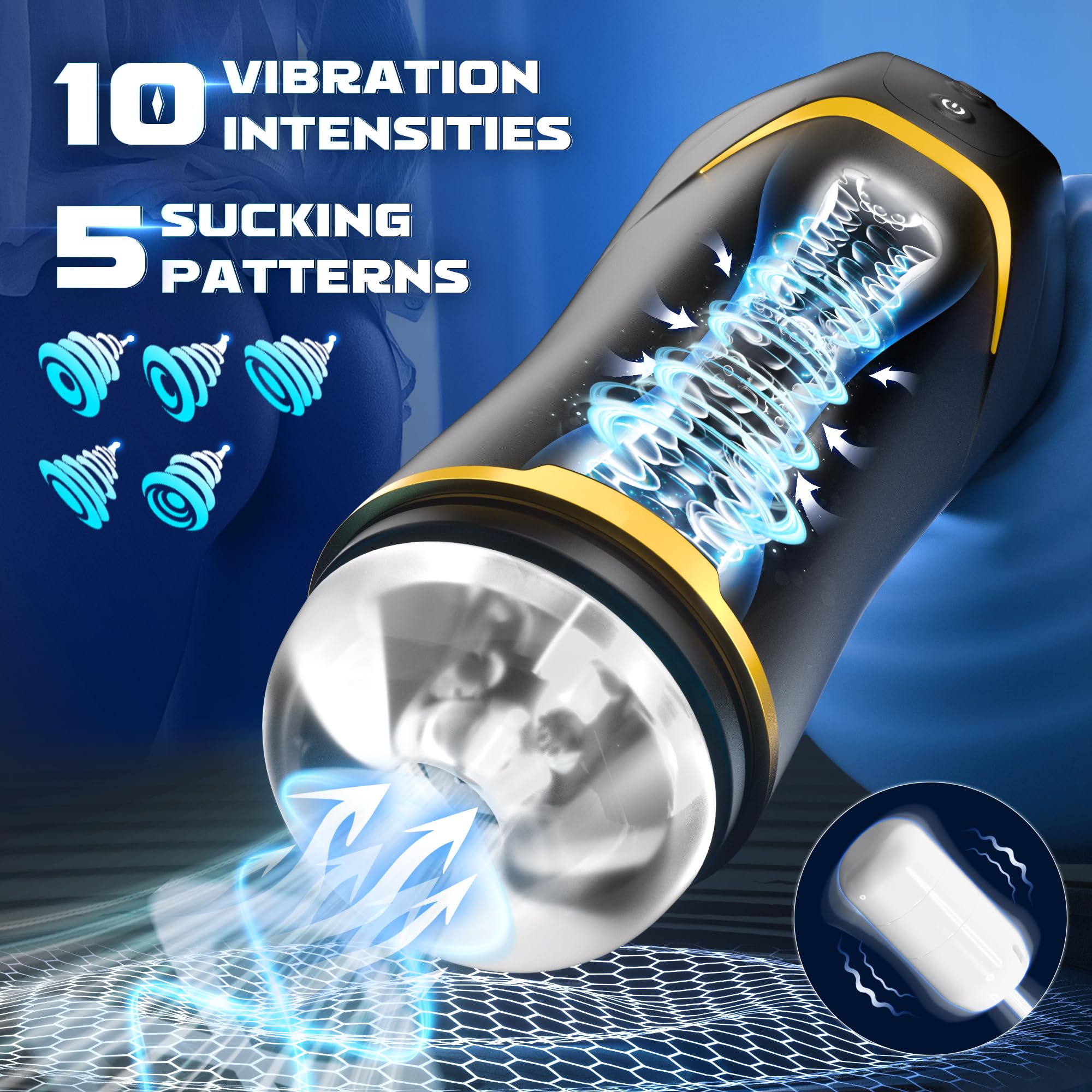 Q: What is the main function of this male masturbator?A: This male masturbator functions as a hands-free sex toy designed to provide intense pleasure through customizable vibration and suction modes.