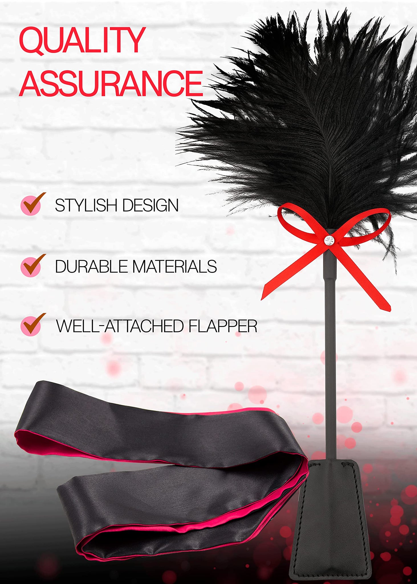 Q: How should I care for the feather tickler and blindfold?A: To care for the feather tickler, gently clean the feathers with a damp cloth and allow them to air dry. The blindfold can be wiped clean with a mild soap solution.
