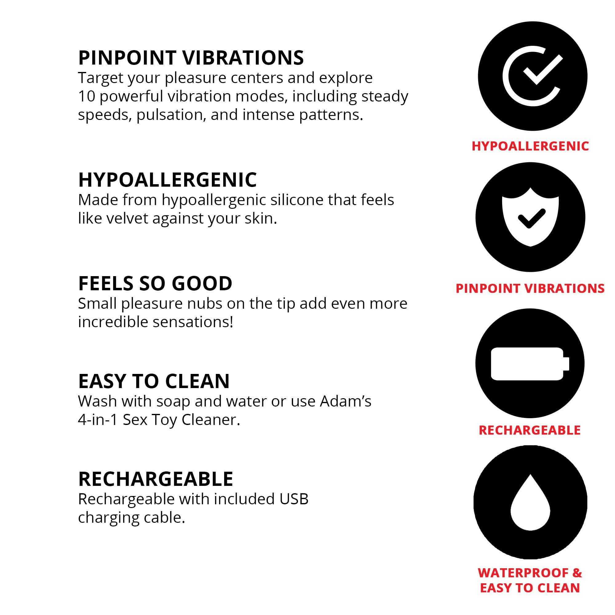 Turn Your Finger Into A 10-Function Vibrating Wonder! Rechargeable & powerful, this vibe fits on your finger for expert control! Put the power to summon body-shaking ''O''s right on your fingertip! Adam & Eve's Silicone Rechargeable Finger Vibe targets all your sweet spots with 10 functions of powerful, rechargeable pleasure. Its smooth silicone sleeve fits onto any finger, so you can send waves of blissful vibration right where you want them. A curvy tip and massaging nubs add to the fun! Rechargeable 10-function finger vibe Great for solo or couples play Smooth and flexible outer silicone sleeve Target tight spots with pinpoint tip 10 functions of vibration, pulsation, escalation Removable chrome-finished ABS bullet can be used separately Rechargeable, includes USB cable 50 minutes of play; full recharge in 3 hours Petite size fits everywhere: 3.39 inches long x .95 inches wide Latex free Waterproof & submersible Be forewarned: this darling silicone finger vibe is little, but those vibrations are fierce! For the perfect accompaniment to any pleasure session, make sure you reach for the Adam & Eve Silicone Rechargeable Finger Vibe. Its loop fits around any of your fingers. This lets you expertly guide its massaging nubs and curvy tip right to your neediest spots. Target clit, nipples, testicles - anywhere and everywhere you desire vibration! Press and hold the power button for 2 seconds to turn it on. Then keep pressing the button to explore all 10 functions, including pulse-pounding steady vibration speeds, mesmerizing pulsation, and intense patterns. All those good vibes shake and shiver through the Finger Vibe's smooth outer silicone sleeve. You can also remove the sleeve and use the bullet all on its own for a totally different set of sensations. Treat yourself to pleasure in the shower or tub, too! Adam & Eve's Silicone Rechargeable Finger Vibe is waterproof and submersible, so it can turn your morning shower into an
