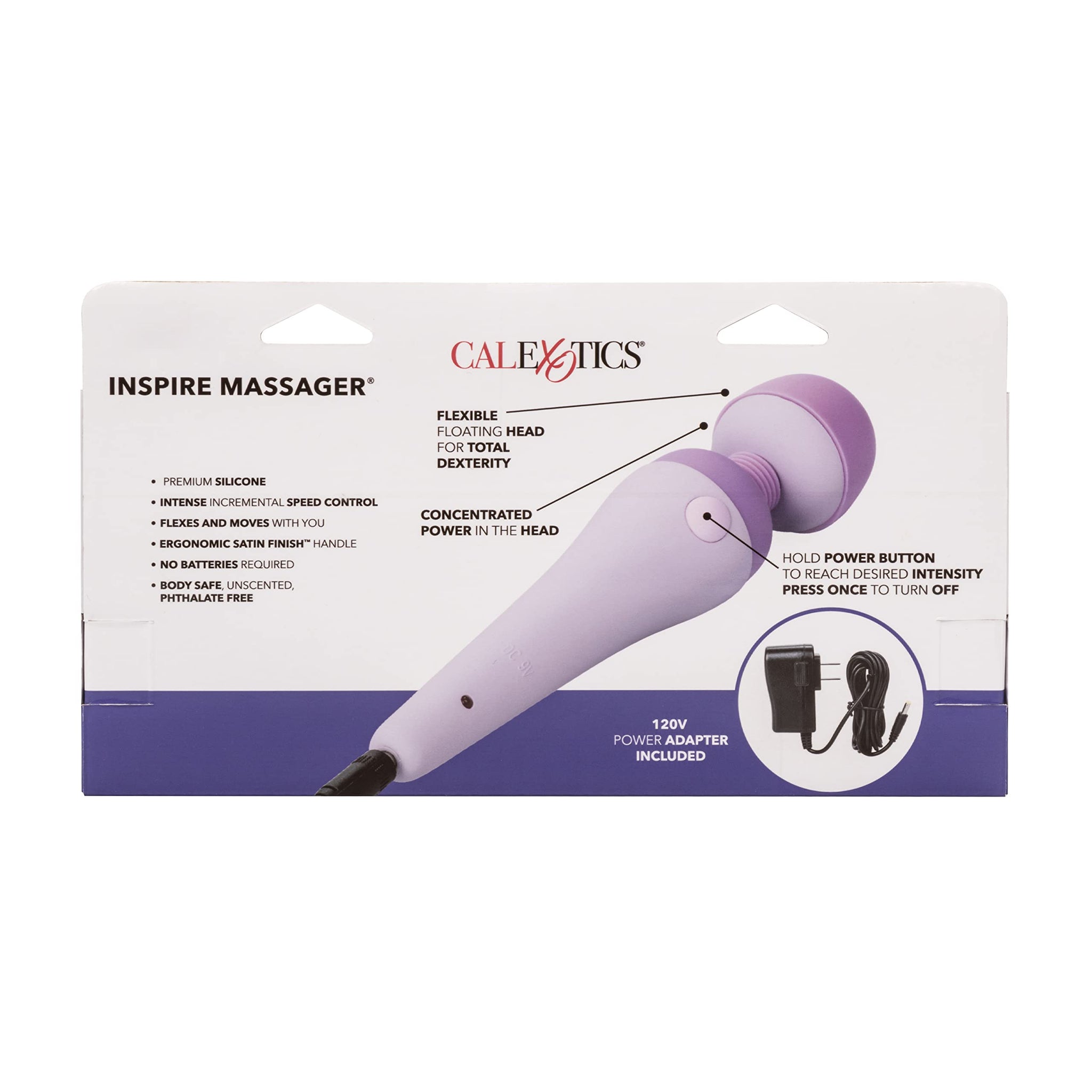 Q: What type of power adapter does the massager use?A: The CalExotics Inspire Massager operates on a 100/240 Volt AC power adapter, which is included with the product.