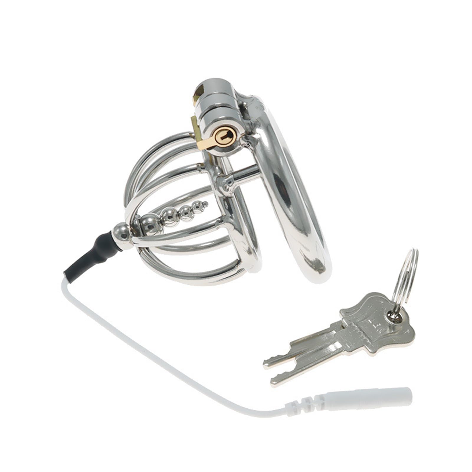 Q: What is included in the Electric Shock Chastity Lock set?A: The Electric Shock Chastity Lock set includes a chastity cage with a bead anal plug and an electric shock feature, designed for personal and couple use.
