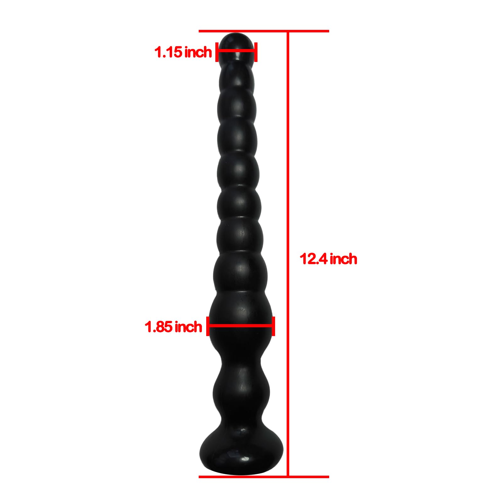 Q: What are the dimensions of the anal beads?A: The small size has a total length of 9.44 inches with diameters ranging from 0.85 inches to 1.35 inches. The large size measures 12.4 inches in length, with diameters from 1.15 inches to 1.85 inches.