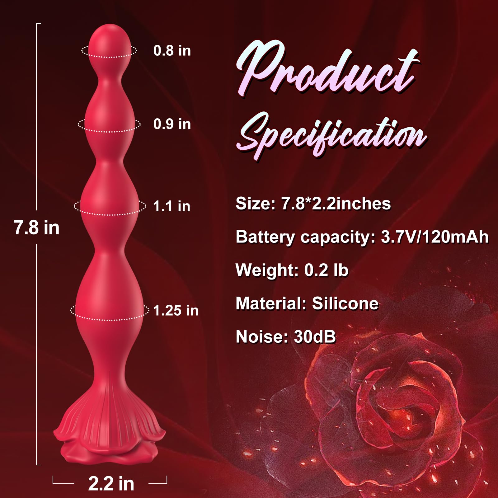 Q: What is the design of the Rose Sex Toy Anal Beads?A: The Rose Sex Toy Anal Beads feature an exquisite rose-shaped base crafted in sleek black, adding elegance and sophistication to intimate moments.