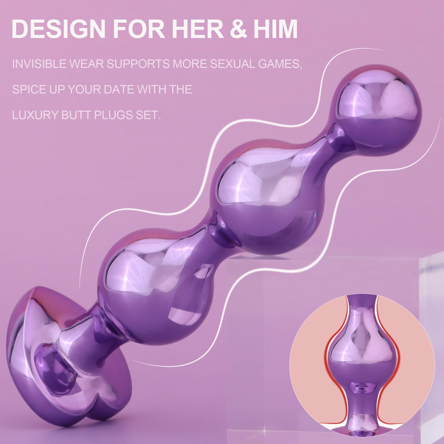 Set of 3 Premium Alloy Anal Plugs:Indulge in incredible pleasure with our luxurious purple alloy anal plugs, designed to shine like exquisite jewelry. This adult toy set offers a perfect combination of benefits: various sizes to suit most users, strong and durable metal construction, and a sleek, smooth surface thanks to advanced electroplating. These features make it both resistant and easy to clean. The enchanting and sensual purple color will captivate you, making this set of anal plugs a lasting companion.