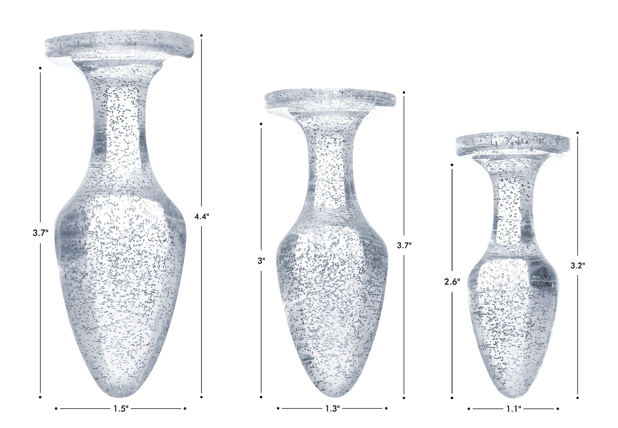 A: The Glitter Gem Anal Plug Set includes three graduated sizes: Small (3.2 inches overall length, 2.6 inches insertable length, 1.1 inches diameter), Medium (3.7 inches overall length, 3 inches insertable length, 1.3 inches diameter), and Large (4.4 inches overall length, 3.7 inches insertable length, 1.5 inches diameter).