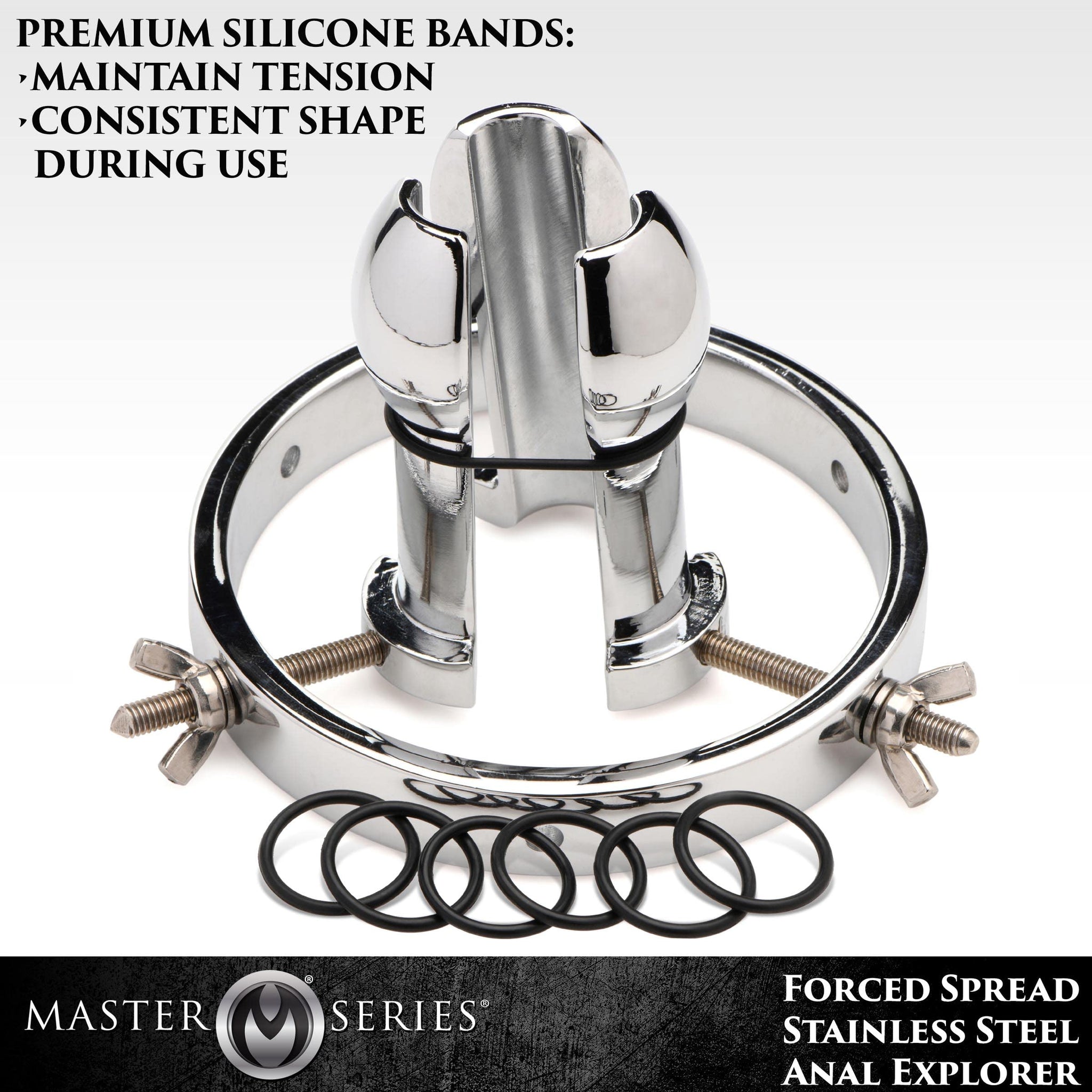 Train your booty to take larger and wider penetration with this Stainless Steel Anal Explorer! This expanding toy has a plug that dilates from 1.6 inches to 3.8 inches in diameter! Enjoy how the cold, hard steel feels inside you or warm it up with a little hot water and introduce temperature play. The smooth stainless steel is nickel-free, body-safe and easy to clean. Use with any lubricant type and stretch open that hole! The tapered tip of the plug makes insertion easy. Once inside, turn the screws to start to stretch the backdoor entry as the plug separates in three separate parts. Take your time so you don't tear anything! This is for extreme anal lovers but anyone can enjoy the pleasures of widening their backdoor! It's perfect for training for fisting, too! The center ring is big enough for most fists to reach through, so you can stretch open the hole in preparation and then slowly bring a hand inside! Comes with 6 silicone o-rings that wrap around the plug as it pulls apart. To clean boil in hot water after use, or use warm water and mild soap then spray with a toy cleaner. Have your partner grab plenty of their favorite, long-lasting, body-safe lube and the toy. Make sure it is clean and doesn't have any rough surfaces. The toy should be completely smooth. Then slowly slide it inside while the plug is together on the smallest setting. Once your partner gets used to that feeling, slowly turn each of the wingnuts so that the screws pull the plug apart. Take your time and let it be a fun, pleasurable and enjoyable scene. See how far you can get, but don't force it or rush it! Once you're ready to end the session, slowly bring the plug back to the smallest setting and then remove it. Be sure to clean it soon after removal.
