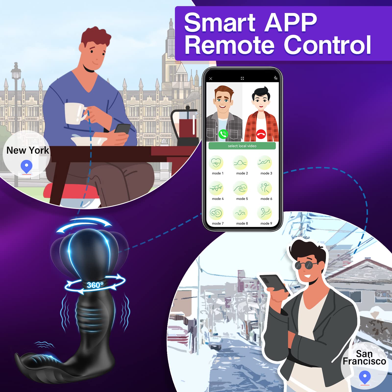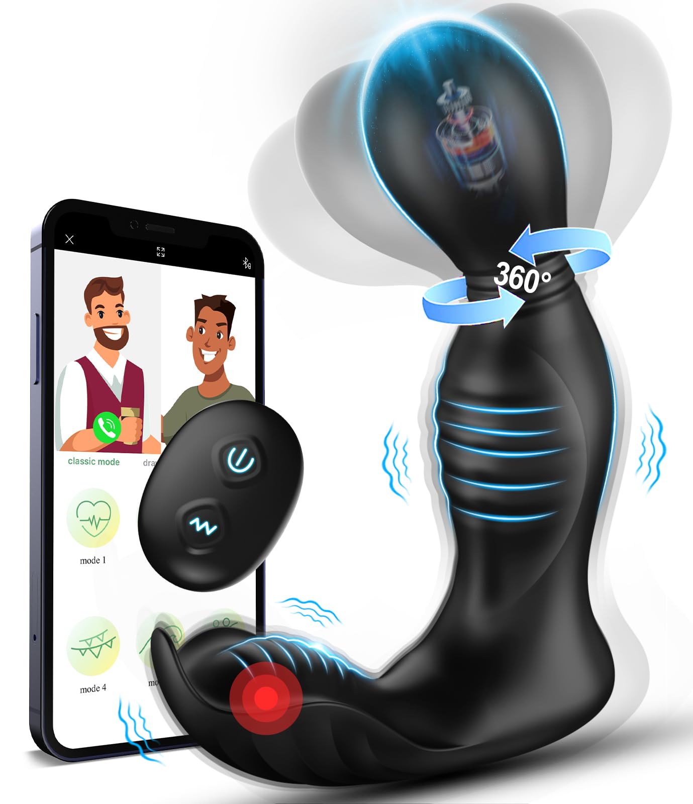 Q: What are the unique features of the Prostate Massager?A: The Prostate Massager offers 9 rotating and vibrating modes, a smart APP remote control for long-distance use, flexible 360° rotation for multi-angle stimulation, and is made of safe, smooth silicone material.
