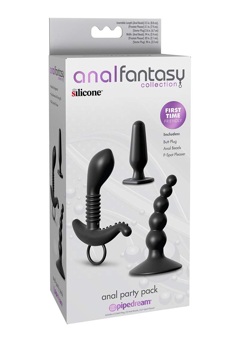 Q: What is included in the Pipedream Anal Fantasy Collection Anal Party Pack?A: The Anal Party Pack includes three beginner-friendly pieces: a tapered butt plug, a prostate probe, and suction-cup anal beads, all designed for first-timers.