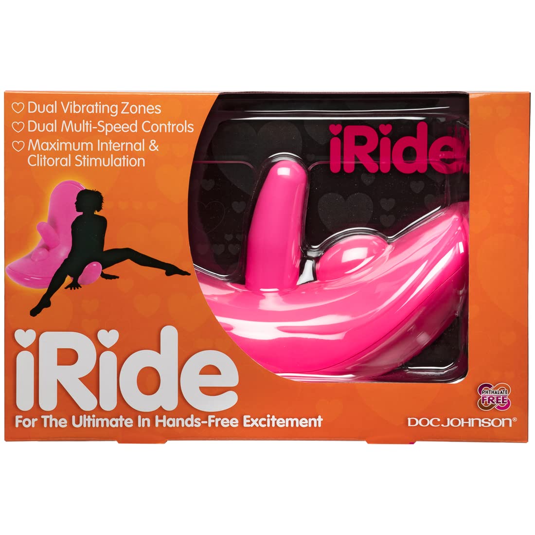 Ride it rock it or spoon it With Doc Johnsons iRide you control the rhythm speed and sensation with the very motion of your body freeing your hands for more important exciting things There are two independently controlled 3level vibrating zones targeted directly at your two most erogenous zones The naturally curved design allows for sensual rhythmic movement while the padded cushion makes for a soft smooth ride Mount the iRide in comfort and rock yourself to ecstasy Made of nonPhthalate ABS and TPR Requires 4 AA batteries not included Pink Approximate Product Dimensions: Saddle; Total Length: 7.25 in. (18.4 cm) Insertable Length: 4 in. (10.2 cm) Width/Diameter: 1.75 in. (4.4 cm) Depth: 12.9 in. (328 mm) Fully Rideable and Designed for Hands-Free Use Multi-Speed Insertable Vibrating Shaft | Multi-Speed Vibrating Clitoral Stimulator Independent Controls for Each Feature | Curved Design for Rhythmic Rocking Phthalate-Free Body-Safe