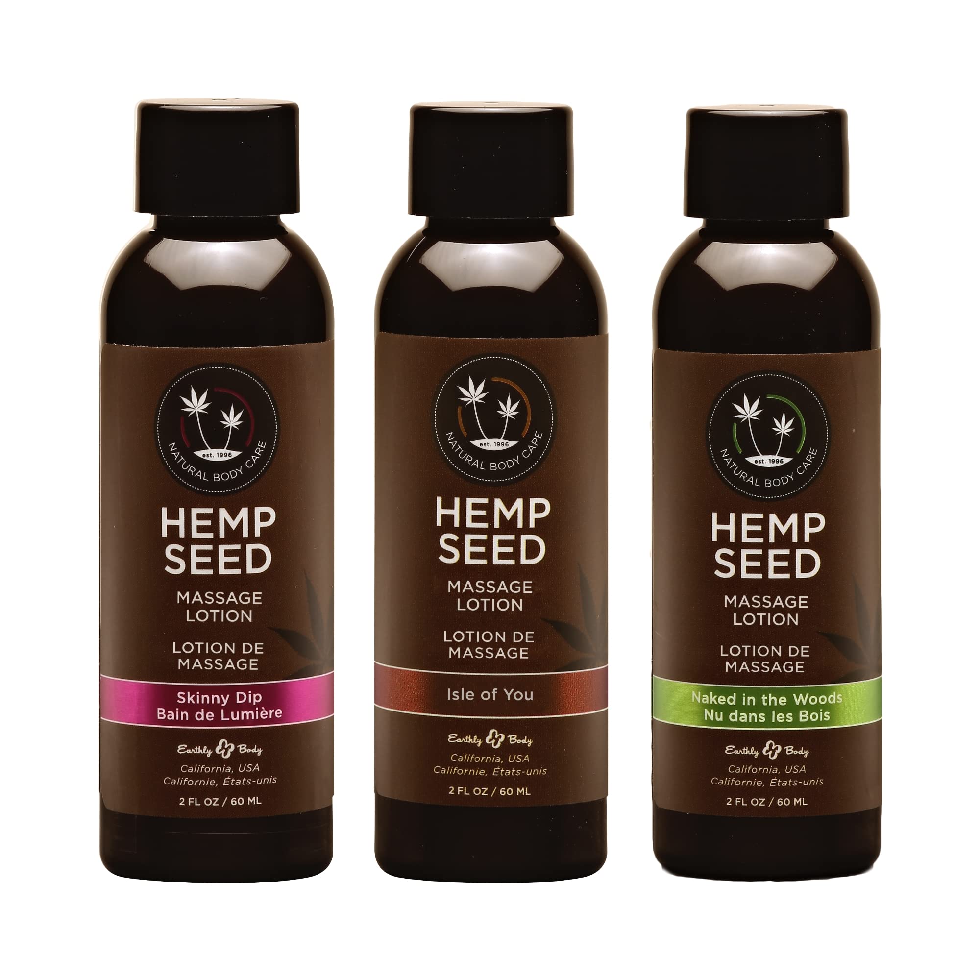 Q: What scents are included in the Hemp Seed Massage Lotion Gift Set?A: The set includes three delightful scents: Isle of You, Skinny Dip, and Naked in The Woods.