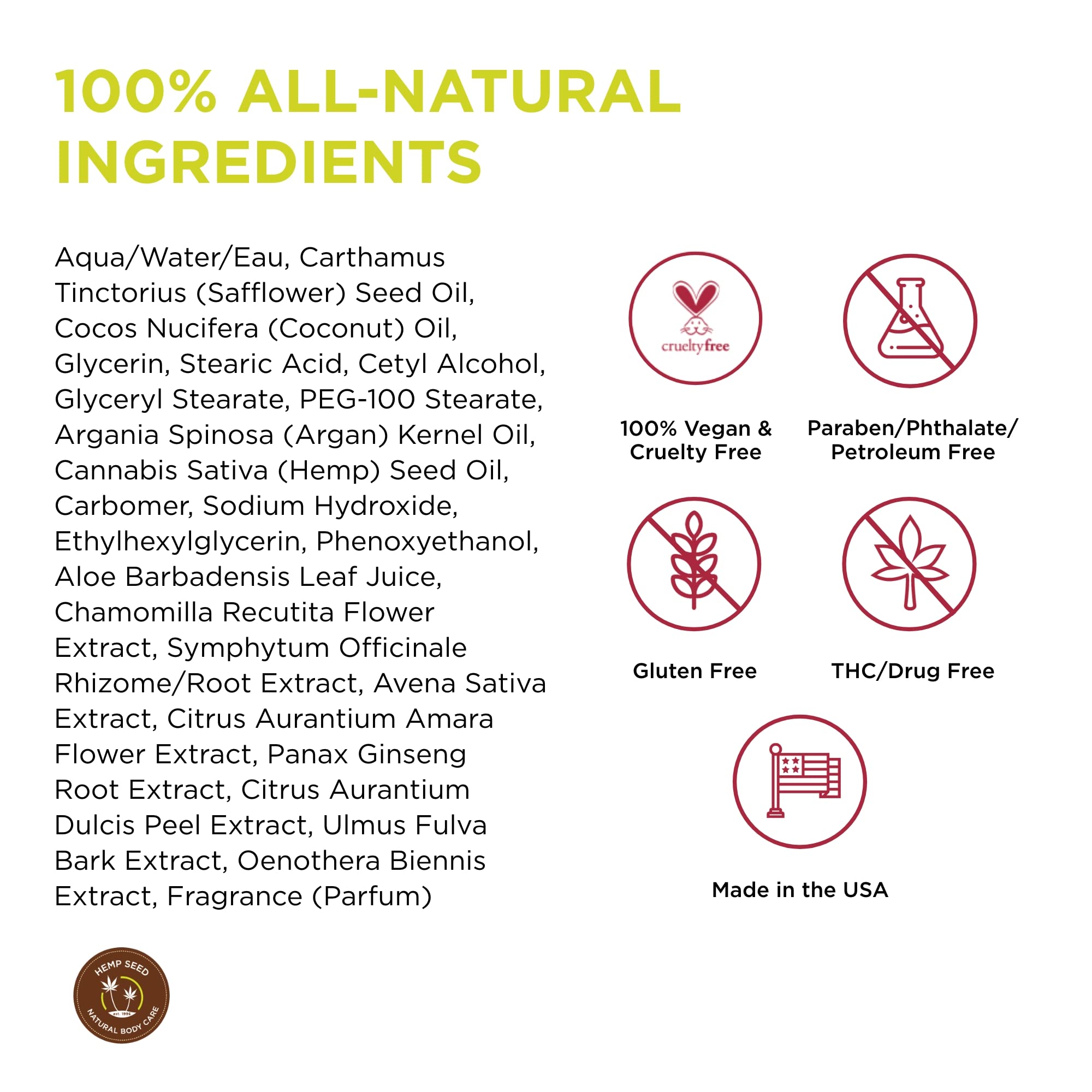 Q: What are the benefits of using hemp seed oil in this lotion?A: Hemp seed oil is known for its moisturizing properties and ability to absorb deeply into the skin, helping to hydrate and nourish.