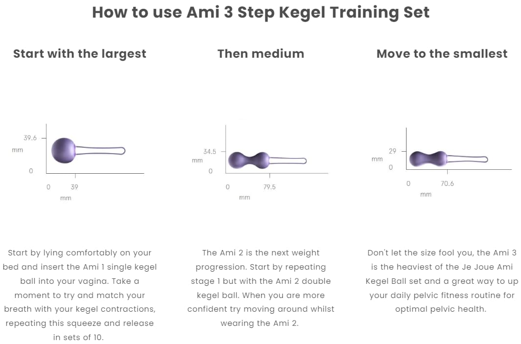 With Three Progressive Weights From Soft Weight Single Ball To Hard And Heavy Double Ball Ami Enhances Pelvic Fitness Allowing Deeper And More Intense Orgasms Alongside A Range Of Health Benefits All At A Self-Selected Pace. BrBrThink Of Ami As Your VaginaS Personal TrainerOuRe Strength Training As You Go About Your Daily Business. Plus It Feels Good Too... BrBrNo Wonder A Set Is Bought Every 15 Minutes! BrBrAmi Has Been Designed With The Softest Velvety 100% Body-Safe Silicone For The Greatest Comfort While In Use. BrBrUlLiA Fully Comprehensive 3-Step Silicone Kegel SystemLiLiActively Exercises And Tones Pelvic Floor Muscles For Enhanced OrgasmsLiLiBeginner Ami 1 Weighs 47 G And Has A 4.3-Inch GirthLiLiIntermediate Ami 2 Weighs 78 G And Has A 3.9-Inch GirthLiLiAdvanced Ami 3 Weighs 106 G And Has A 3.6-Inch GirthLiLiErgonomic Retrieval Loops Make Removal EasyLiLiBase Type: Finger LoopLiLiCircumference: 4.25 InchesLiLiInsertable Length: 3.5 InchesLiLiLength: 3.5 InchesLiLi100% VeganLiUl