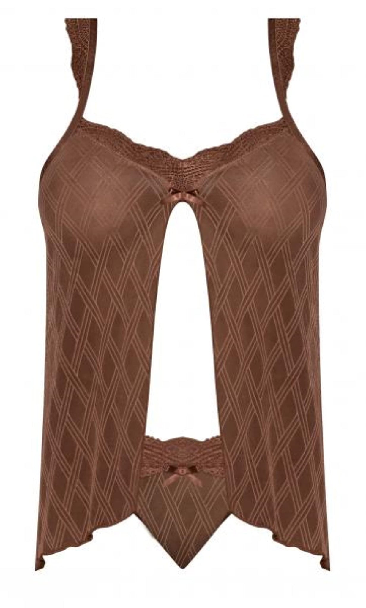 From The Exposed By Magic Silk Collection This Style Includes: A Babydoll Featuring A Flowy Non-Restrictive Hip-Length Design With An Open Flyaway Design In Front Lace Trim Throughout The Front And Back Elastic And Adjustable Shoulder Straps Trimmed With Lace And Gold-Tone Sliders That Meet Together In The Back And A Matching Thong Featuring Soft Lace All Around To Hug Your Hips. BrBrStretchy Jacquard Mesh And Soft Lace In Caramel With Sleek Gold Metal Hardware.