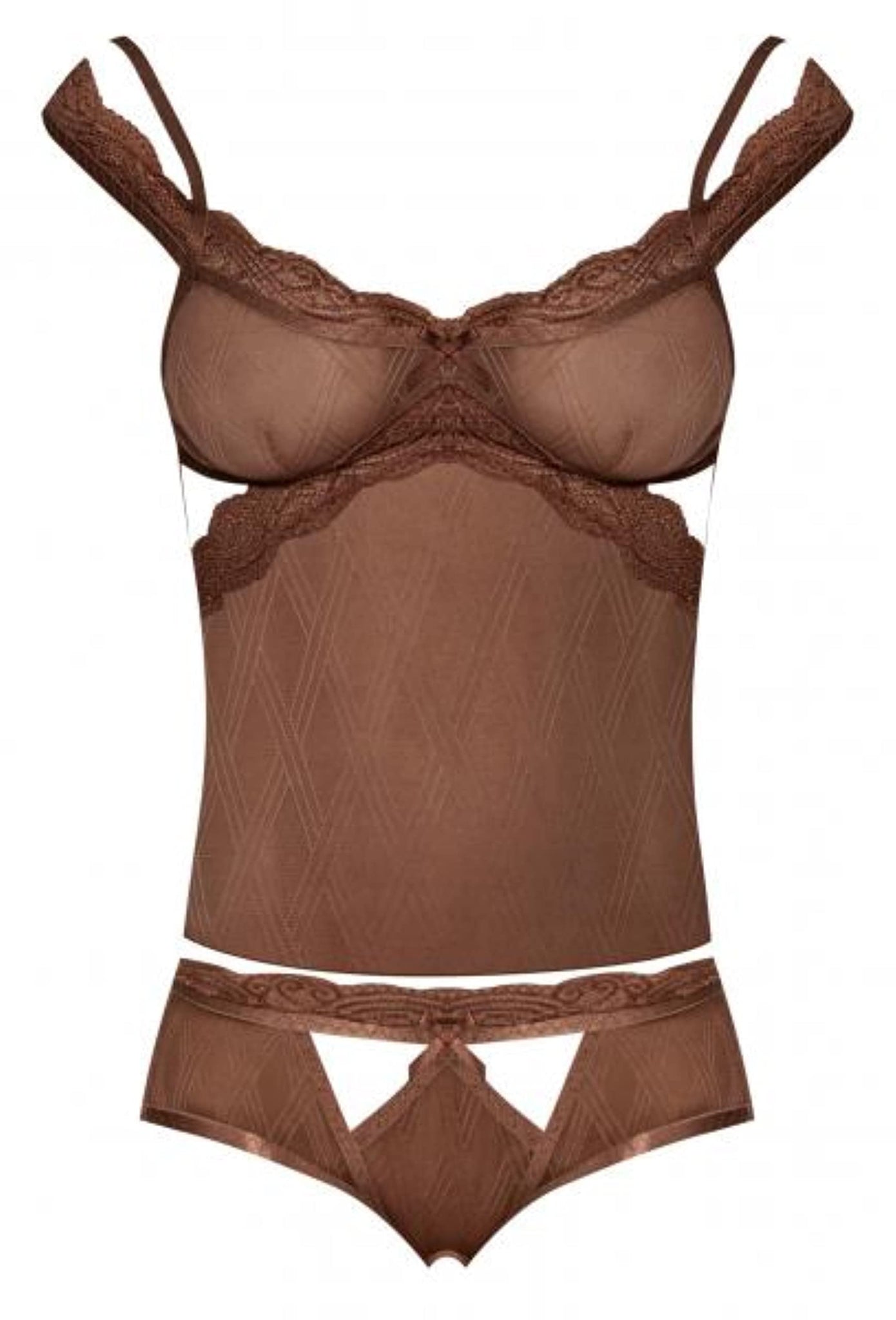 From The Exposed By Magic Silk Collection This Style Includes: A Cami Featuring Cutout Designs On Each Side Lace Trim In The Front And Sides Adjustable Shoulder Straps With Gold-Tone Sliders In A Lace And Elastic 2-Strap Design On Each Side And A Matching Crotchless Lace-Trimmed Panty With A Peek-A-Boo Design In The Front In A Boyshort Style. BrBrStretchy Jacquard Mesh And Soft Lace In Caramel With Sleek Gold Metal Hardware.