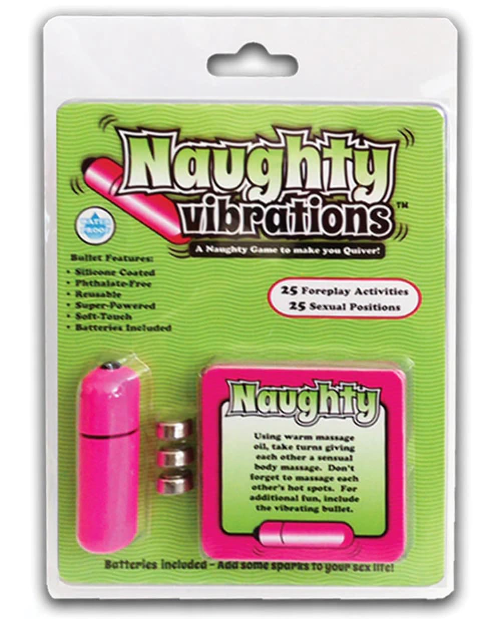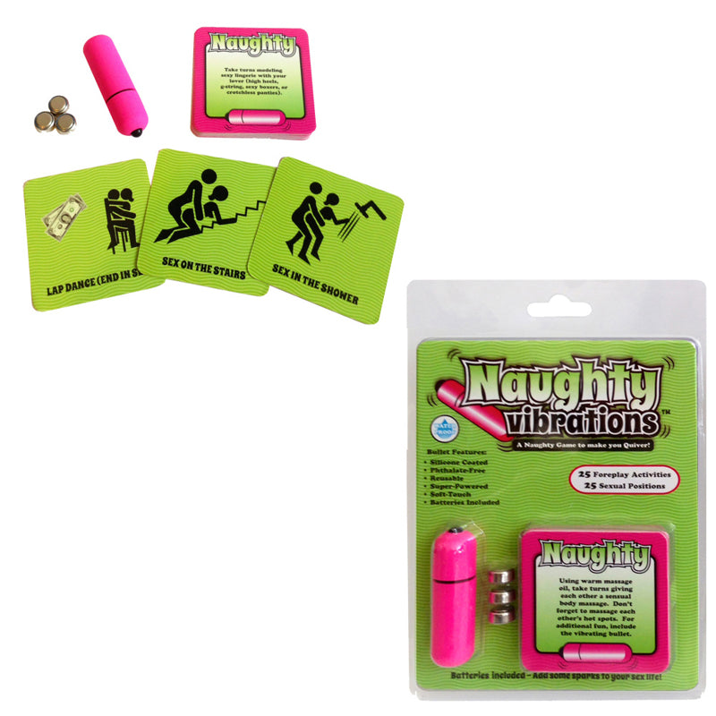 Q: What is included in the Ball and Chain 53718: Naughty Vibrations product?A: The product includes a vibrating bullet and a deck of cards featuring 25 foreplay activities and 25 different sex positions.