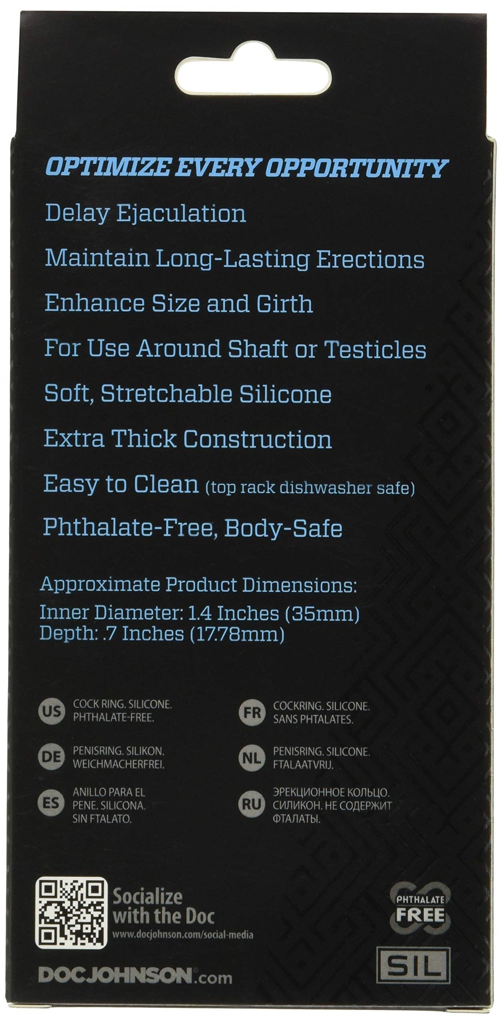 Q: What are the dimensions of the Doc Johnson OptiMALE C-Ring?A: The approximate dimensions are: Width/Diameter: 2.25 in. (5.7 cm), Circumference: 4.5 in. (11.4 cm), Depth: 0.7 in. (18 mm).