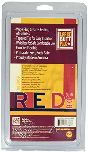 Q: What are the dimensions of the Doc Johnson Red Boy Large Butt Plug?A: The Doc Johnson Red Boy Large Butt Plug measures approximately 5.2 inches in total length, with an insertable length of 4.5 inches, a width of 2.2 inches, and a circumference of 7 inches.