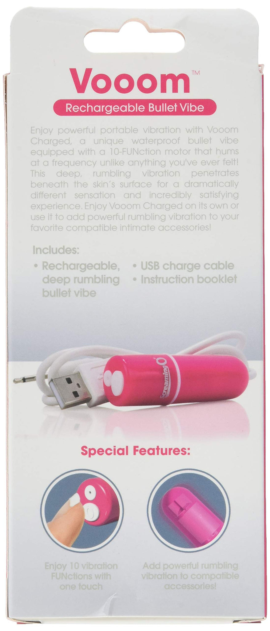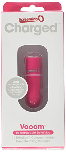 Q: What is the Screaming O Charged Vooom Rechargeable Bullet Vibe?A: The Screaming O Charged Vooom is a rechargeable bullet vibrator featuring a unique 10-function motor designed for deep, rumbling vibrations, providing a different sensation compared to traditional vibrators.