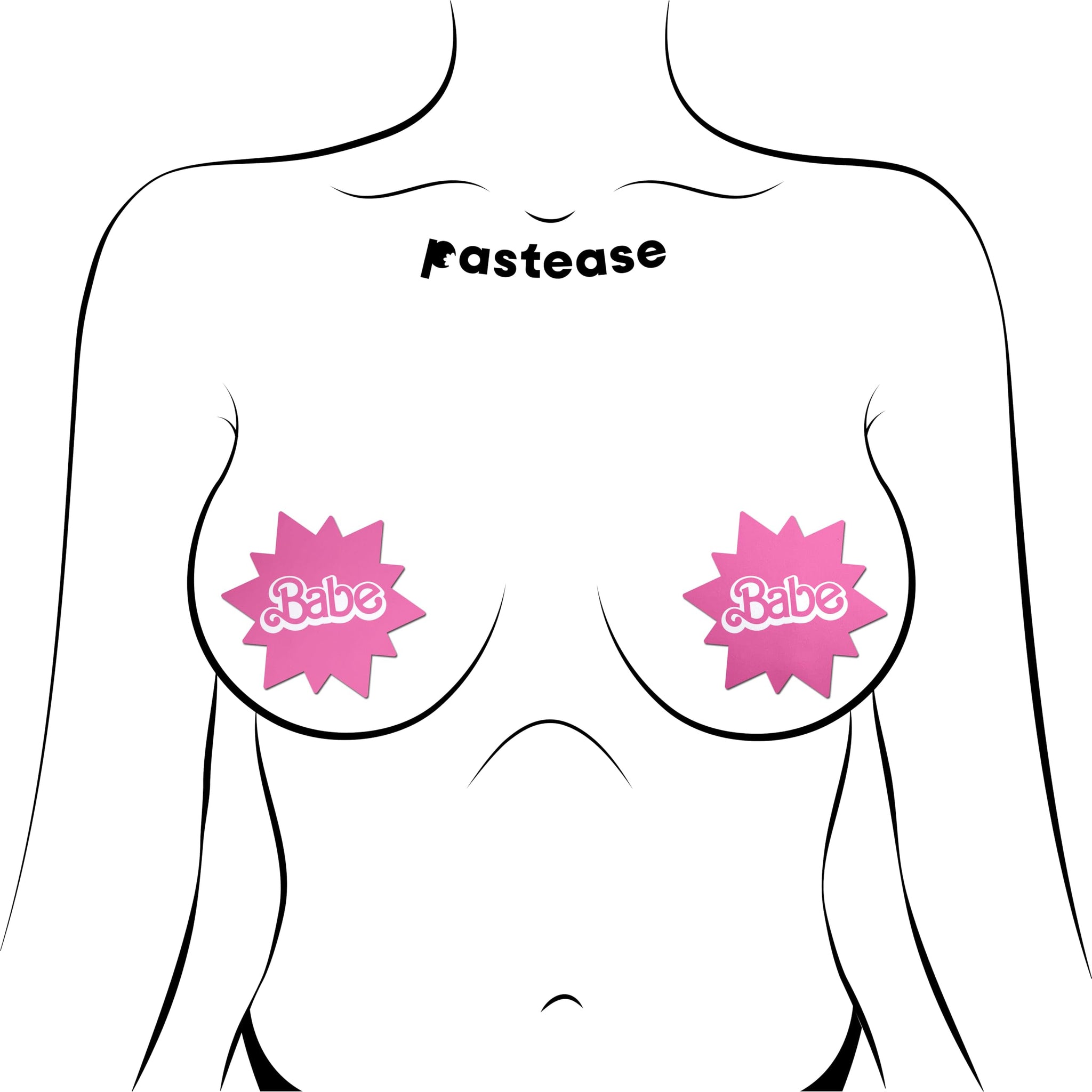 Pastease Babe Pink Stars Nipple Pasties. Introducing Babe Doll Pink Sunburst Nipple Pasties! These fun and flirty pasties are designed in the style of everyone's favorite doll. With their bright Pink color and Sunburst shape, they are sure to make a statement and add pop to any outfit. Made from soft and comfortable materials, Pastease pasties are gentle on your skin and can be worn for hours without discomfort. The medical grade adhesive backing ensures that they stay securely in place, even during high energy activities like dancing or jazzercising. Plus, they are waterproof and sweatproof, so you can wear them with confidence in any situation. Perfect for festivals, parties, play or just to celebrate you, the Babe Pink Sunburst nipple pasties are peel and stick fun that will help you express your unique style and Barbie girl personality. So why wait, girl? Add a touch of glamor doll to your wardrobe today with Pastease's Babe Pink Sunburst Nipple Pasties! Dimensions: 3 inches by 2.8 inches. Coverage 2 inches. Categories: Lingerie, Clothing, Naughty Role Play, Nipple Play, Pasties, Accessories. Primary package. X2. 2023.