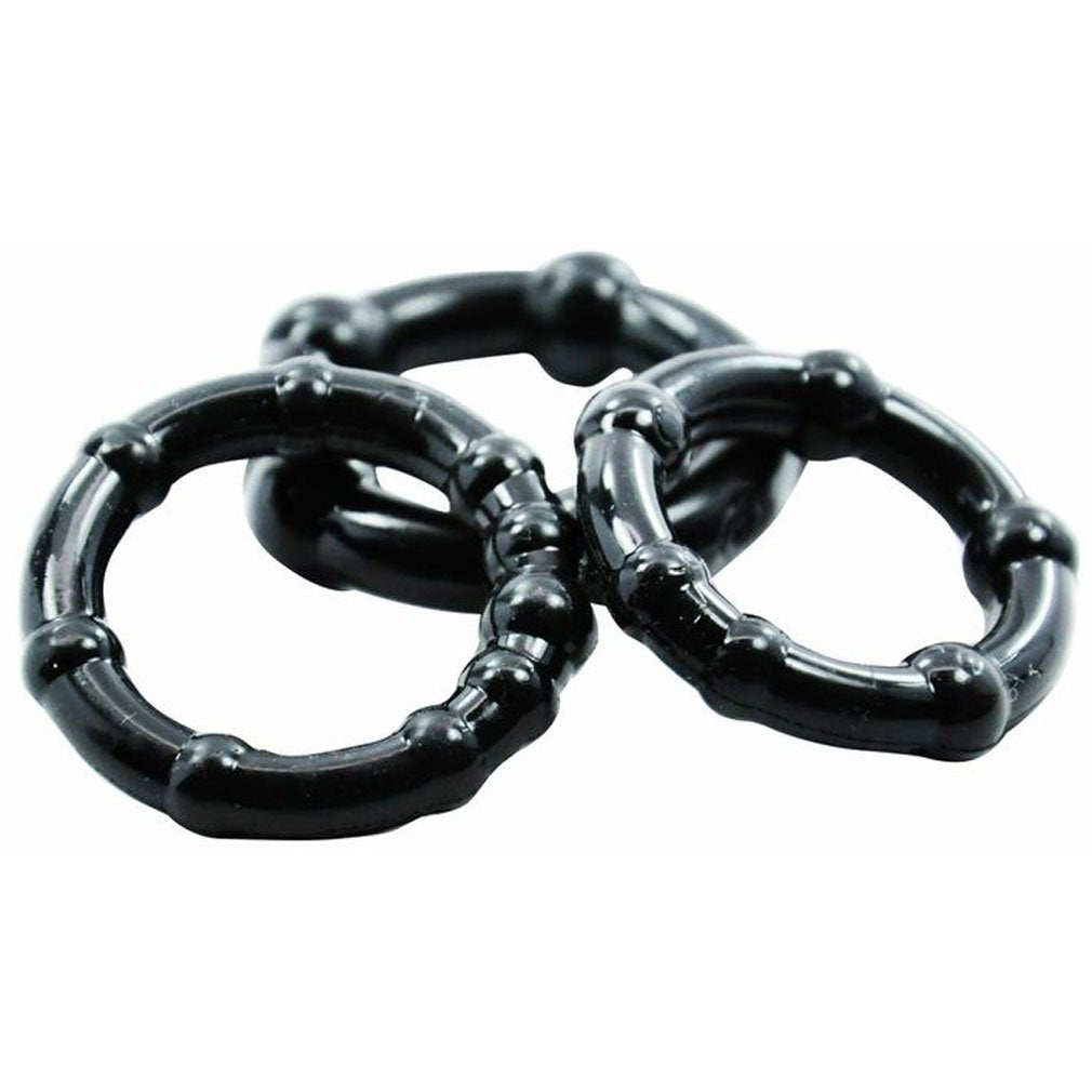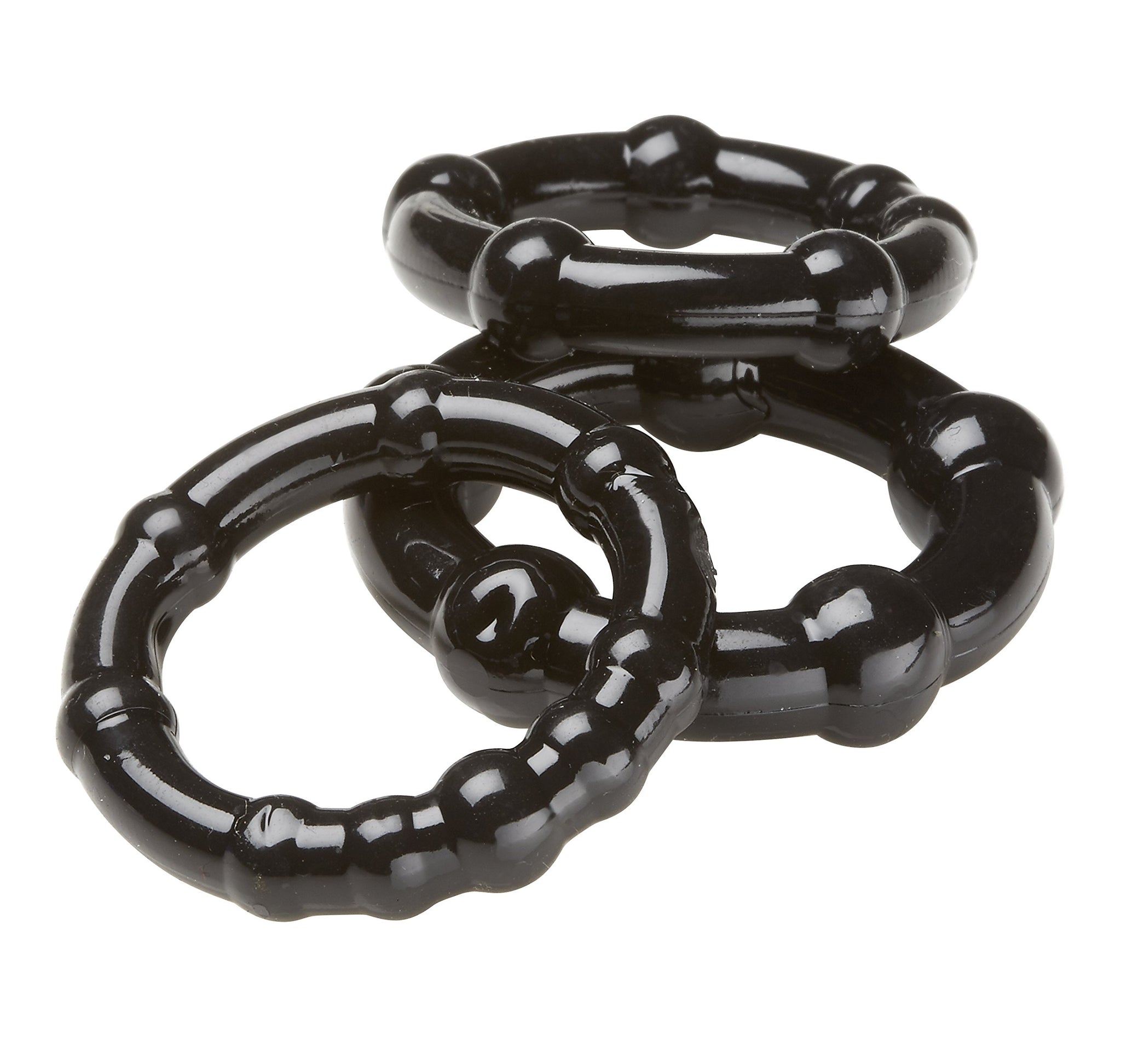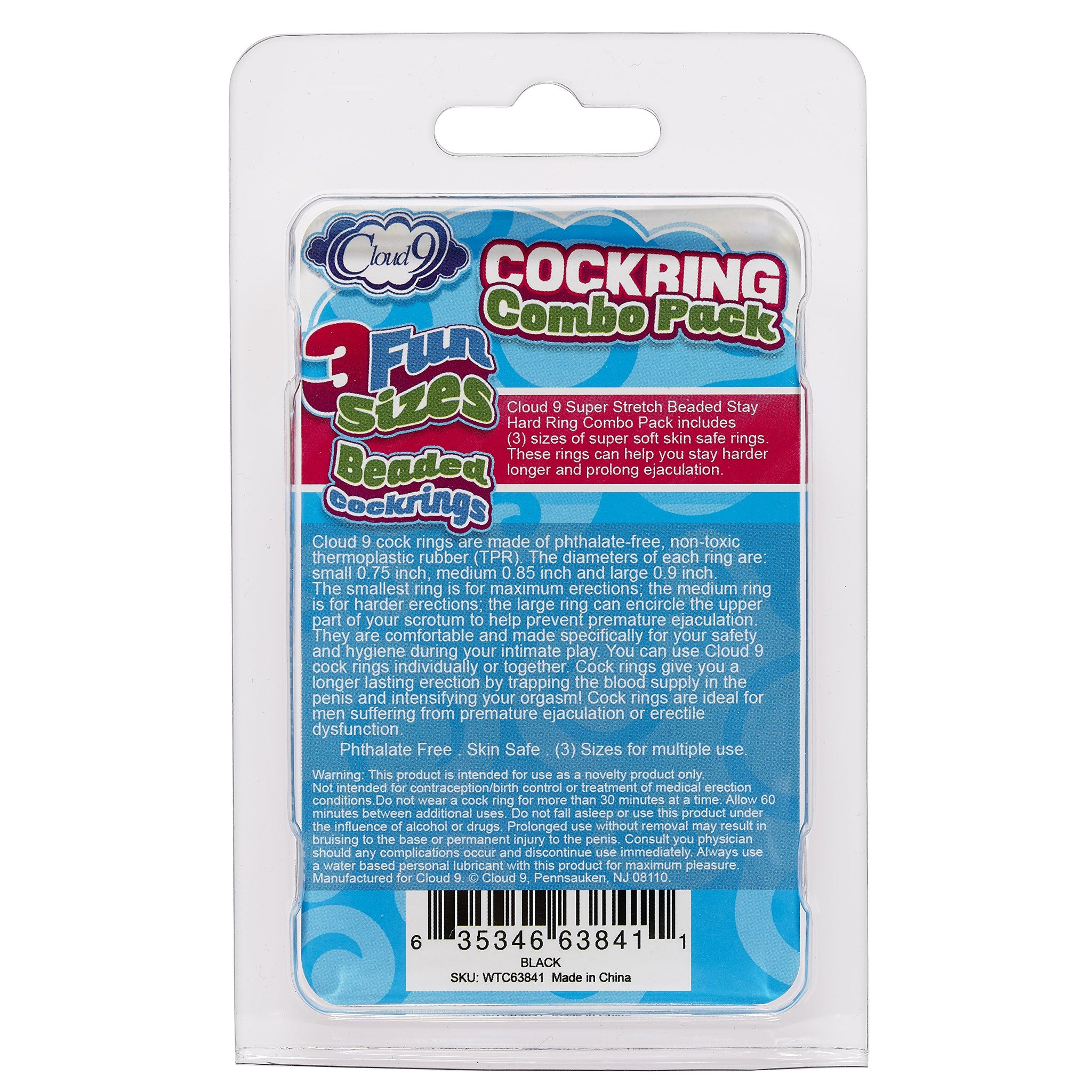 Cloud 9 Novelties Super Stretch Beaded Stay Hard Ring Combo Pack Black includes three sizes of super soft skin safe rings. These ring can help you stay harder longer and prolong ejaculation. Cloud 9 cock rings are made of phthalate free, non-toxic thermop