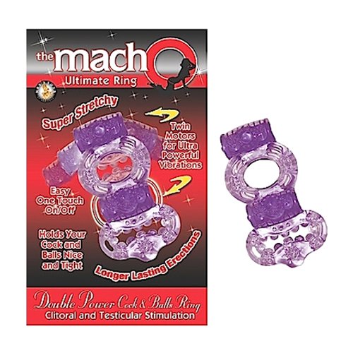The Macho Ultimate Ring Double Power Cock and Ball Purple Ring. Super stretchy. Twin motors for ultra powerful vibrations. Easy one touch on/off. Holds your cock and balls tight. Longer lasting erections. Double Power Cock Ring Clitoral and Testicular Sti