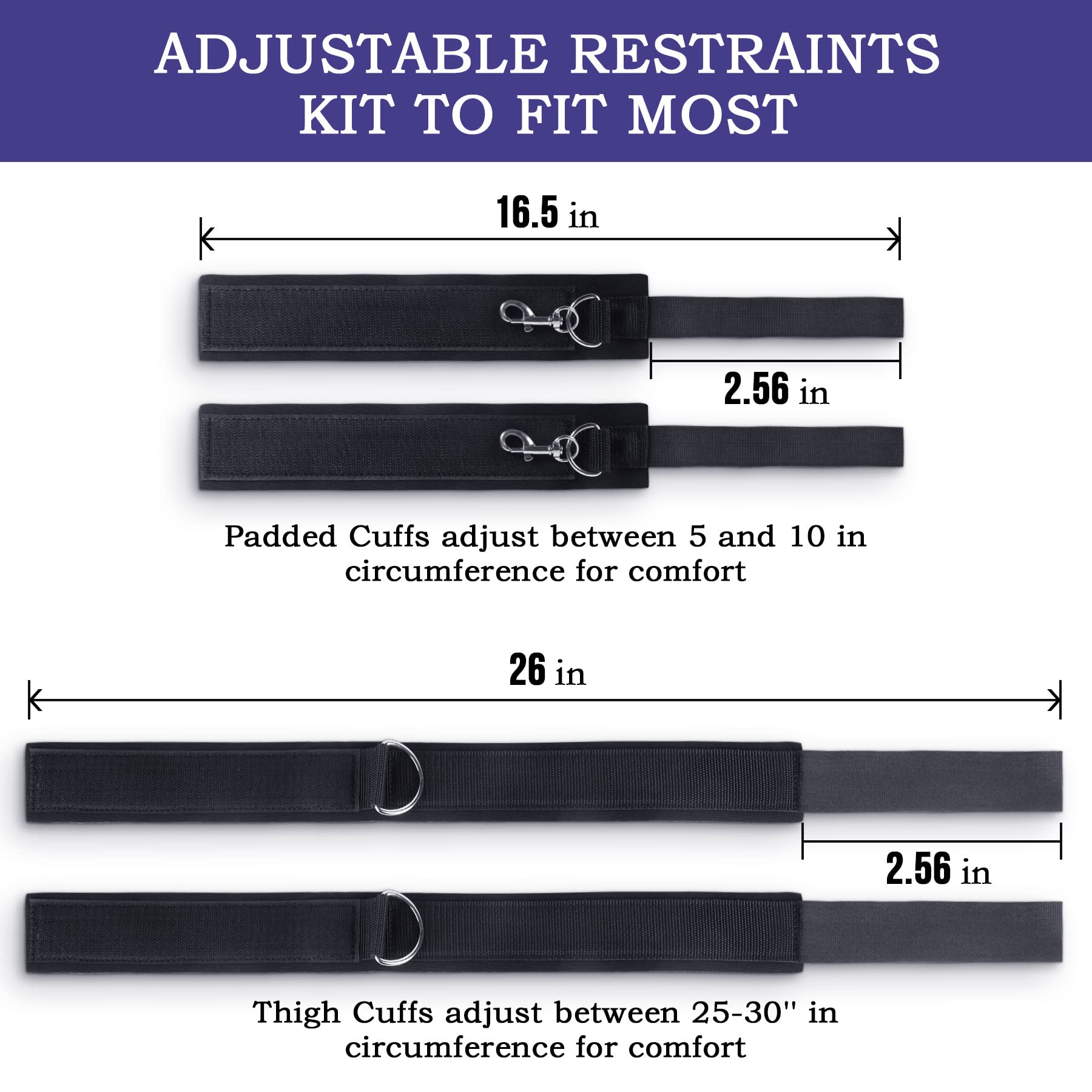 Fully Restrain Your Lover Anywhere You Go!While most bondage restraint kits require your bed posts or a similar object to act as a tie-down, this specialized restraint set is completely independent and adjustable to fit most, so you can tie your lover up anywhere! ? 2-way thigh restraint for binding legs and arms? Easily customizable to be enjoyed with or without arm restraint? With hook and loop fastenings and broad strapping keeps play comfortable? Detachable cuffs can be used on their own to bind wrists only? Lightweight metal and cotton designsThis restraint kit comprises two strap sets. Each set features a large cuff, designed to be worn around the thigh, and a completely detachable padded wrist cuff that can be attached to the thigh cuff buckle place. Wear the restraints for maximum bondage. Also, the detachable cuffs can be enjoyed on their own for simple handcuffs or ankle cuff bindings.