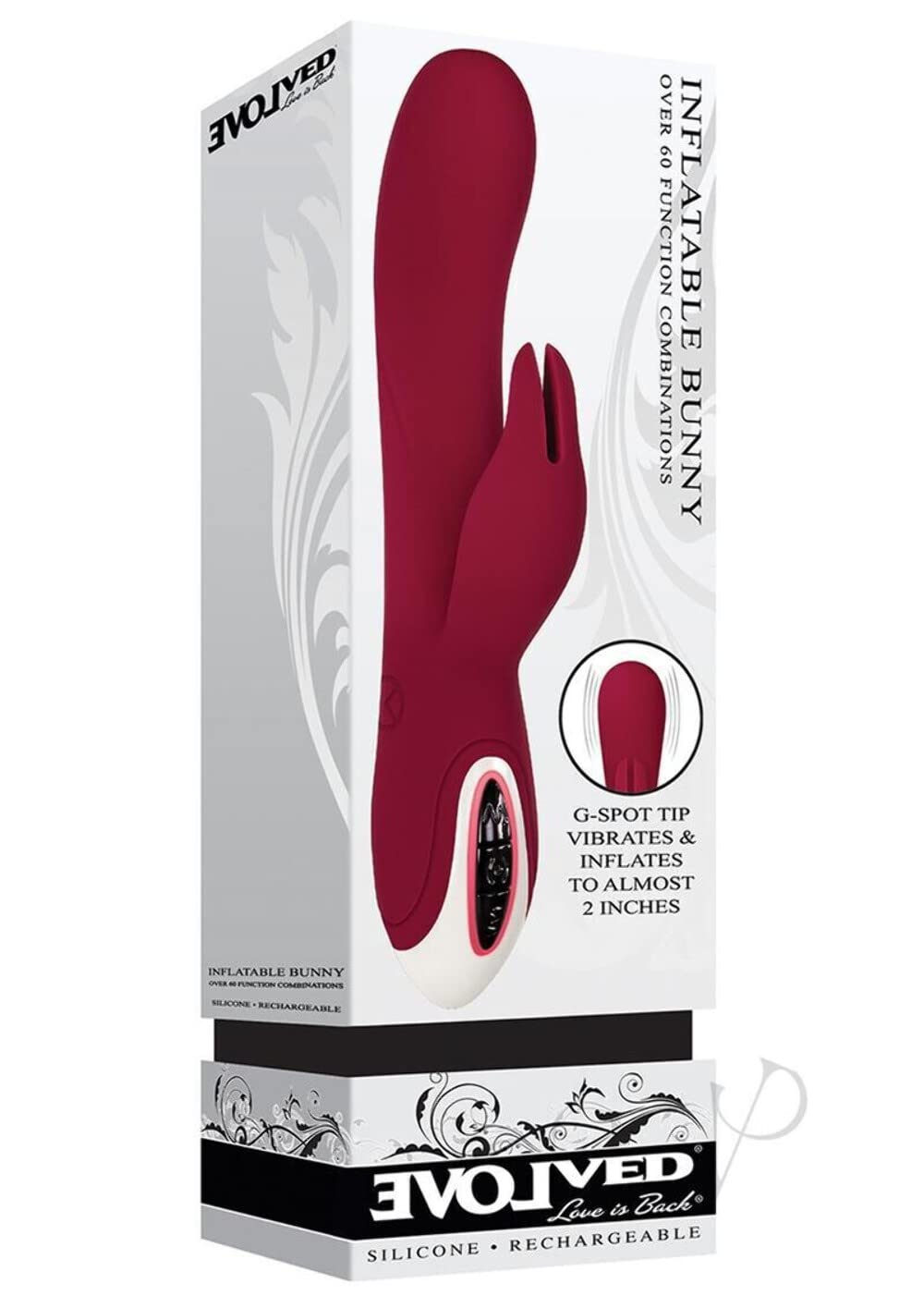 Evolved Love Is Back - Inflatable Rechargeable Silicone Bunny - Over 60 Function Combinations - G-Spot Tip Vibraties & Inflates To Almost 2 Inches - Burgundy
