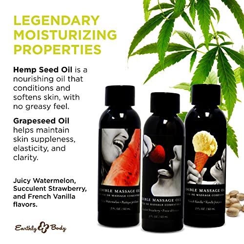 Q: What are the flavors included in the Earthly Body Edible Massage Oil Gift Set?A: The Earthly Body Edible Massage Oil Gift Set includes three flavors: Watermelon, Strawberry, and Vanilla.