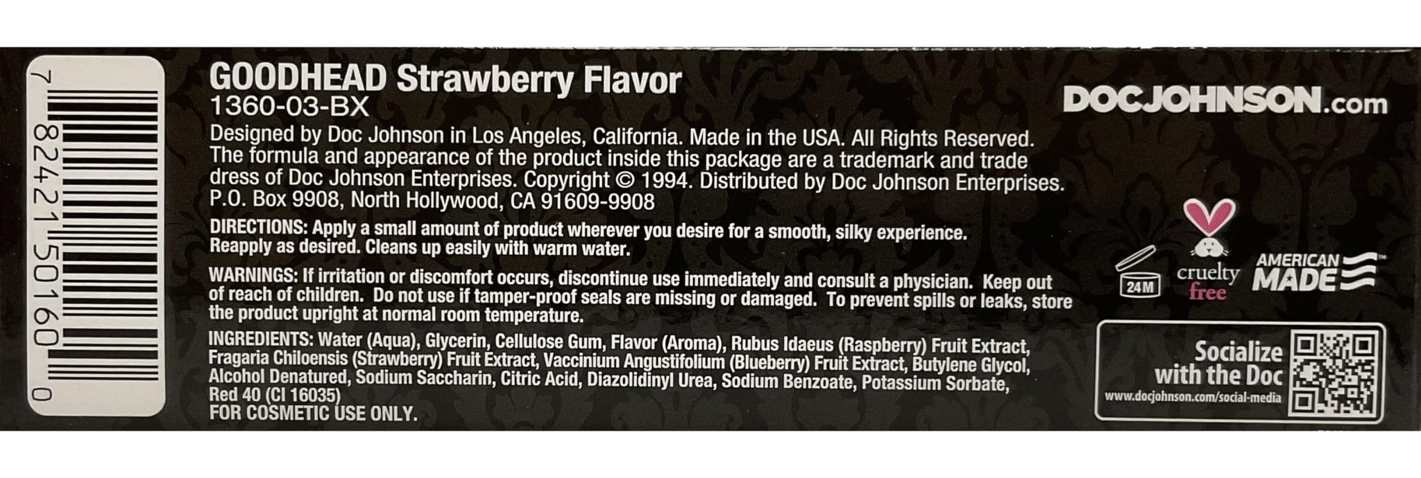 Q: What is the shelf life of Good Head 4 OZ. Strawberry BX?A: The shelf life is typically indicated on the packaging. Generally, lubricants have a shelf life of 1-3 years if unopened and stored properly.