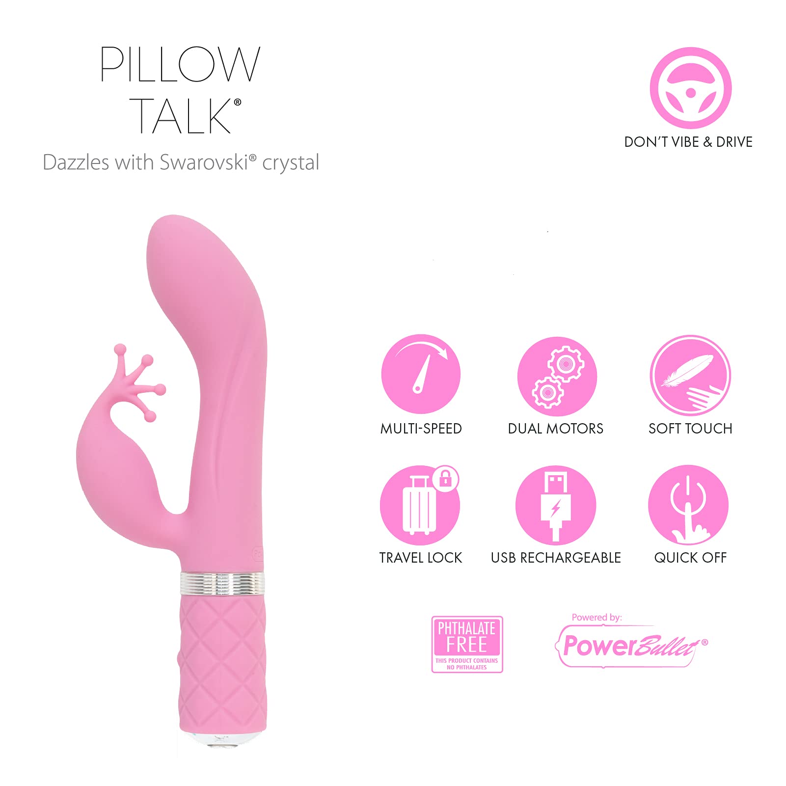 Pillow Talk Kinky Clitoral With Swarovski Crystal Pink From Bms Enterprise. Kinky From Pillow Talk Is A Dual Motor Vibrator That Is Specially Designed For Clitoral And G-Spot Stimulation Simultaneously. It Has Four Crown Like Tips That Have Been Designed Keeping In Mind Some Major Pleasure Points. The Elegantly Arched Body Of This Rechargeable Vibrator With Contoured Lines On Either Side Targets The G-Spot And The Curved Clitoral Arm Works On The Most Sensitive Areas To Give Pleasure. The Cushioned Texture Of This Vibrators Handle Makes It Easy To Hold And The Swarovski Crystal Bedazzles This Luxurious Sex Toy. Key Features: Two Vibrating Motors. Super Silky High Grade Silicone Finish. Deep And Rumbling Power Bullet Vibrations. Designed With Simple Elegance For Your Pleasure. Incremental Speed Control For Precise Power. Rechargeable For Cordless Play. Flexible For Optimal G-Spot Stimulation. Comfortable Cushion Textured Time: Up To 1.3 Hours. Charge Time: 3 Hours. A Special White, Small Bristle Brush Is Included Inside The Box For Effectively Cleaning The Grooves Of This Sex Toy.