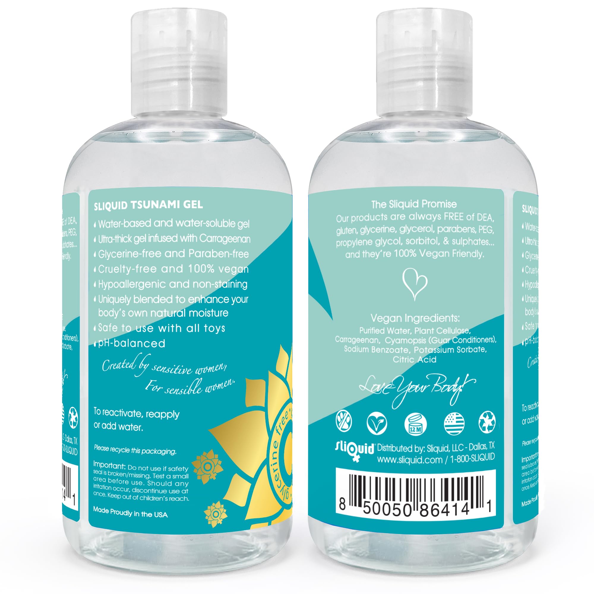 Sliquid Tsunami Is An Ultra-Thick, Water-Based And Water-Soluble Intimate Lubricant, Infused With Carrageenan. Carrageenan, A Natural Seaweed Extract, Is One Of Nature'S Most Effective Moisturizers. When Blended With Naturals H2O, The Base Formula For The Sliquid Naturals Collection, This Natural Seaweed Extract Delivers A Sensual And Slick Glide With The Added Essential Healing Properties Of The Sea.Sliquid'S Plant Cellulose Serves As A Natural, Vegan-Friendly, And Gluten-Free Thickening Agent. Creating The Ultra-Thick Gel Consistency Of Tsunami, Sliquid Has Increased The Amount Of Plant Cellulose And Carrageenan, Offering Added Hydration, Slickness, And Tissue And Cell Restoration Essential For Healthy Skin Vitality. This Formula, Like All Sliquid Lubricants, Is Ph-Balanced, Glycerin And Paraben-Free, Cruelty-Free, And 100% Vegan-Friendly.Sliquid Tsunami Is Hypoallergenic, Non-Toxic, Non-Staining For Easy Clean Up, And Completely Safe To Use With Condoms And All Toy Materials.Water-Based And Water Solubleultra-Thick Gel Formulasafe To Use With All Toysalways 100% Vegan Friendlynon-Staining And Easy To Clean Upglycerin Free And Paraben Freehypoallergenic And Nontoxicblended With Natural Seaweed Extractuniquely Blended To Emulate Your Body Own Natural Moisture