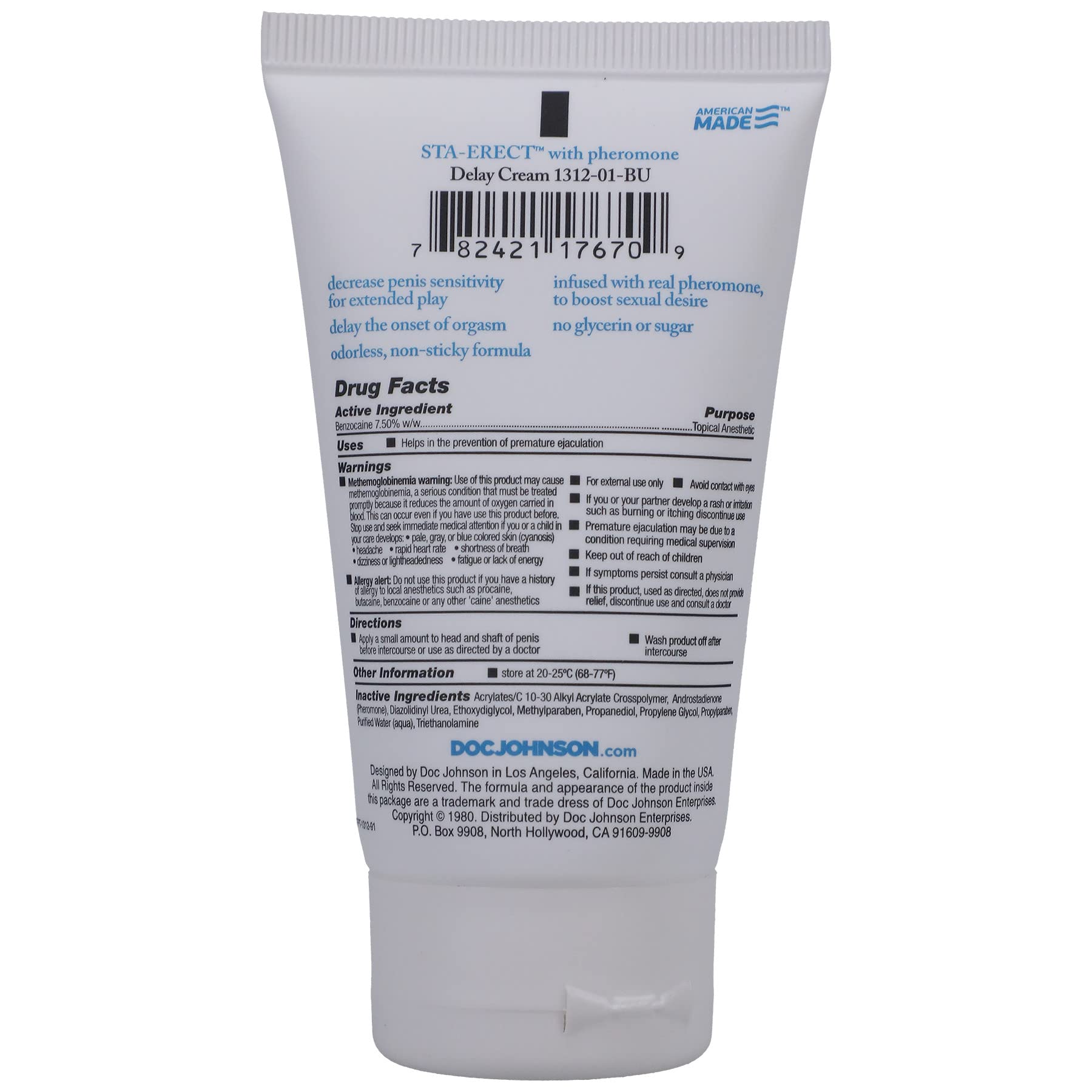 Q: Is this product safe to use?A: Doc Johnson's Sta-Erect Delay Cream is formulated to be safe for topical use. However, it is recommended to perform a patch test before full application and consult a healthcare provider if you have concerns.