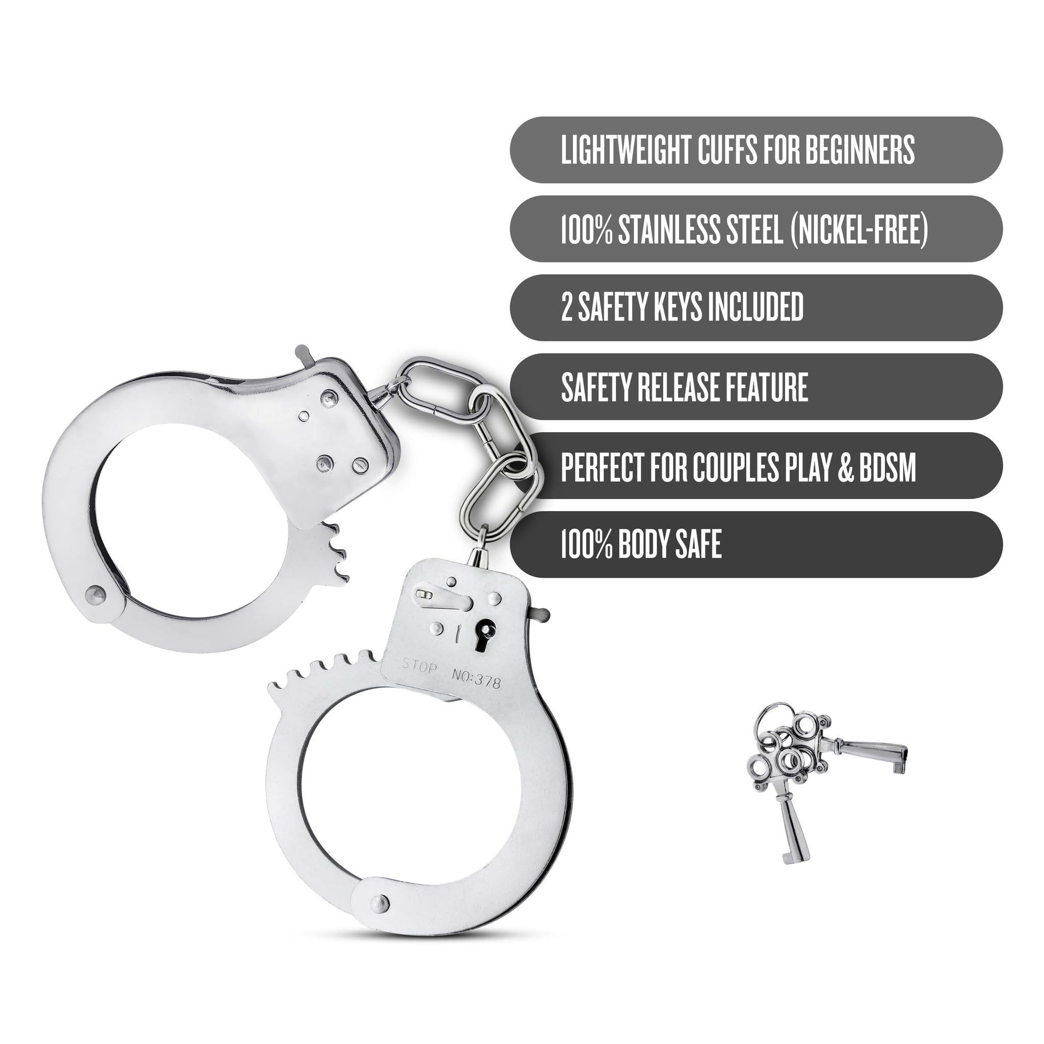 Q: Do the cuffs come with safety features?A: Yes, the cuffs feature a safety release lever and come with two matching keys to ensure a quick and easy release during play.