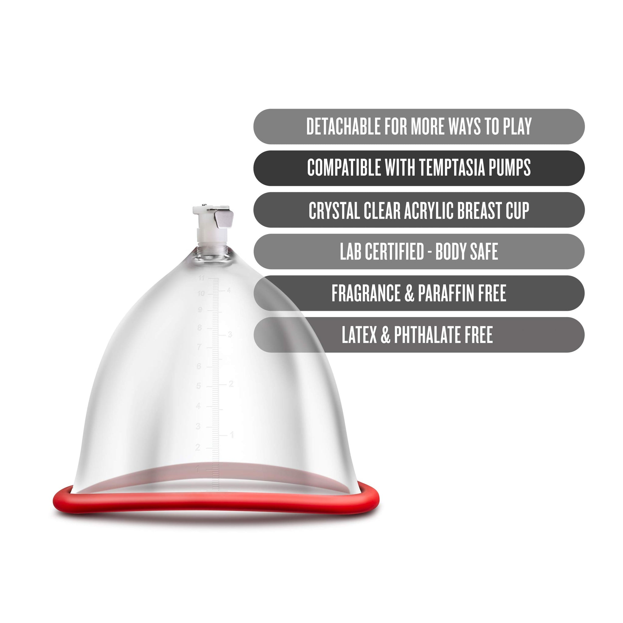 The Temptasia Breast Pump Cup Large Is Compatible And Interchangeable With Other Temptasia Pumps And Accessories. In Use With A Quality Pump It Will Bring Temporary Engorgement And Heightened Sensitivity As The Pump System Increases Circulation To Your Breast. This Cylinder Is Also Detachable If You Are Seeking To Hold The Suction While You Play. Made Of Body Safe Acrylic The Breast Pump Cup Is Easy To Use And Easy To Clean. Size: 4.75 Inch Diameter Cup.