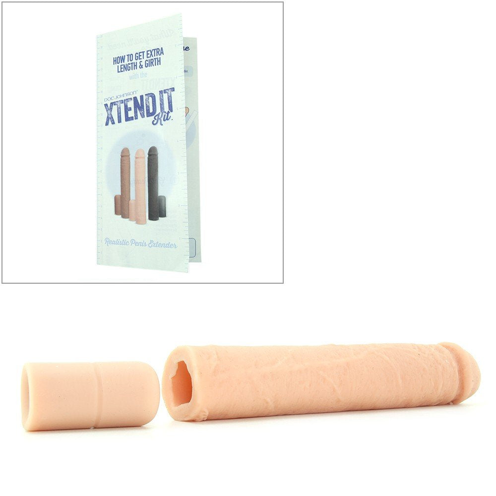 Q: What is included in the Doc Johnson Xtend It Kit?A: The Doc Johnson Xtend It Kit includes a hollow 9" sleeve, a built-in 1" extension at the head, and a plush 2" extension for customizable length.