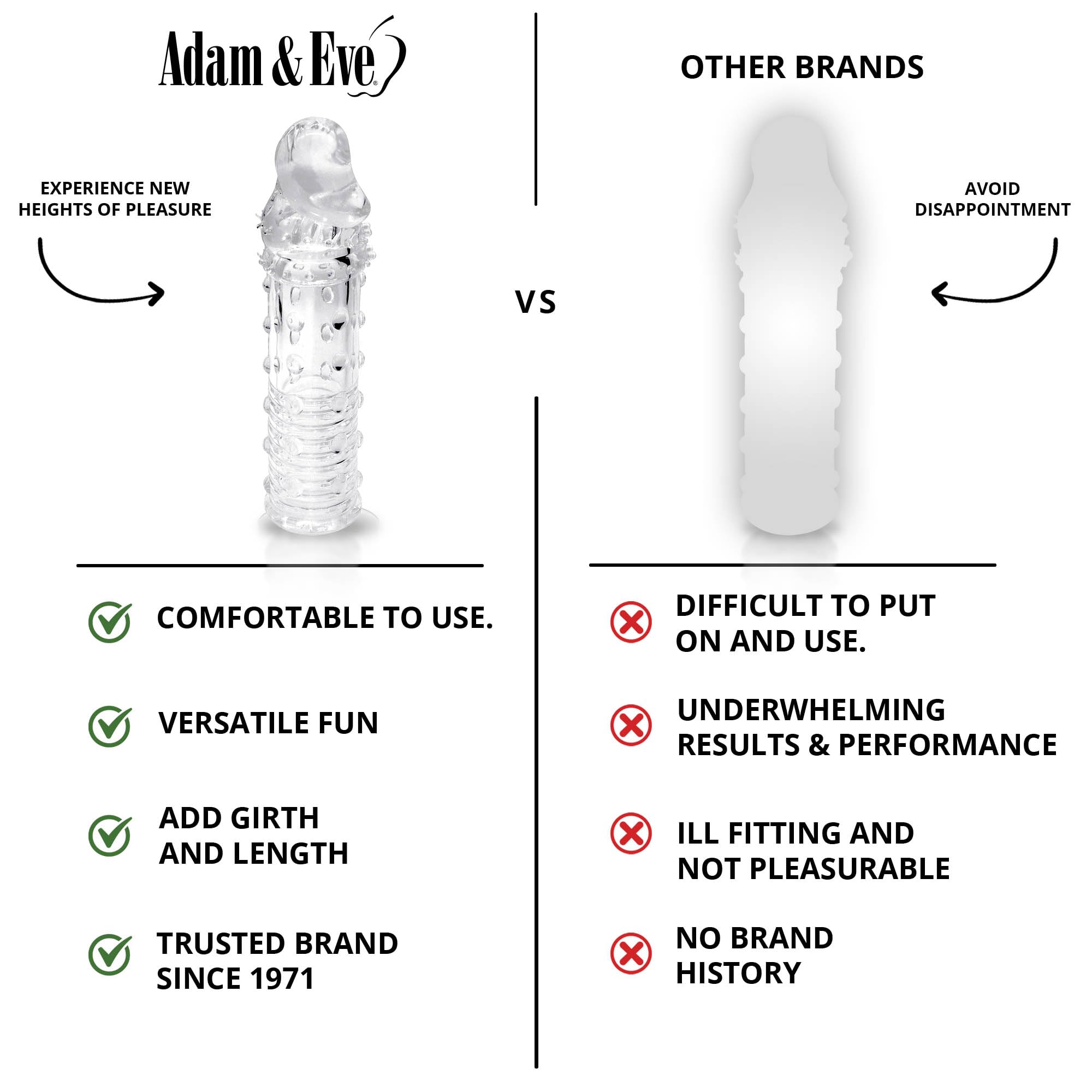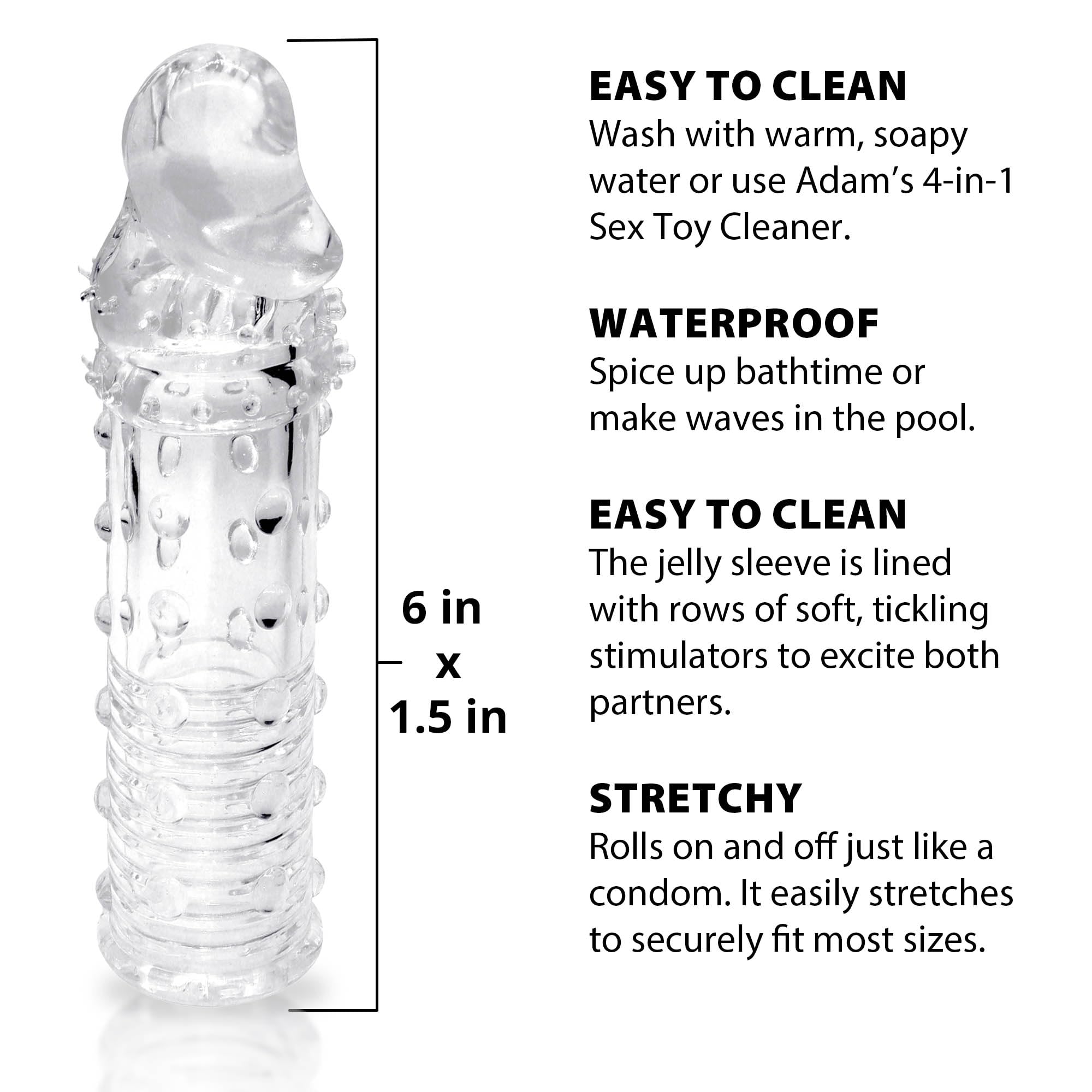 Adam and Eve line Adams Penis Extension features: 6 inches long by 1.5 inches wide penis enhancing sleeve. Adds 2 inches of length plus girth. Made from body safe, phthalate free soft and stretchy clear jelly Thermoplastic Rubber TPR materials. Realistic