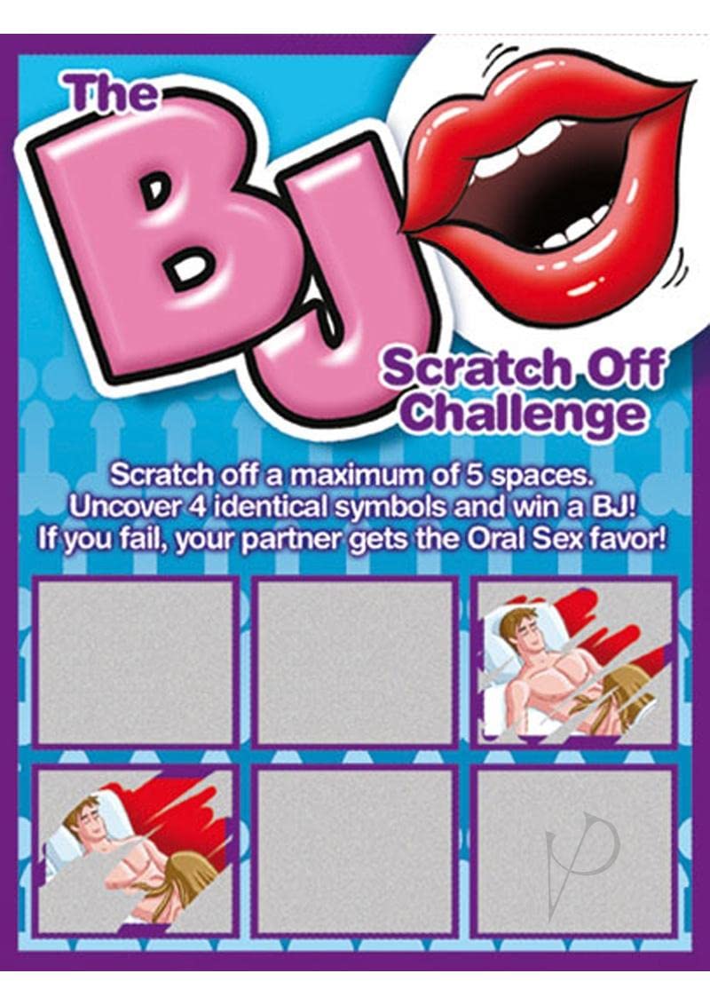 Q: How do you play The BJ Scratch Off Challenge?A: To play, participants scratch off a maximum of five spaces on the card. If they find five identical spaces among those scratched, they win a BJ. If they do not match, their partner is entitled to an oral sex favor.
