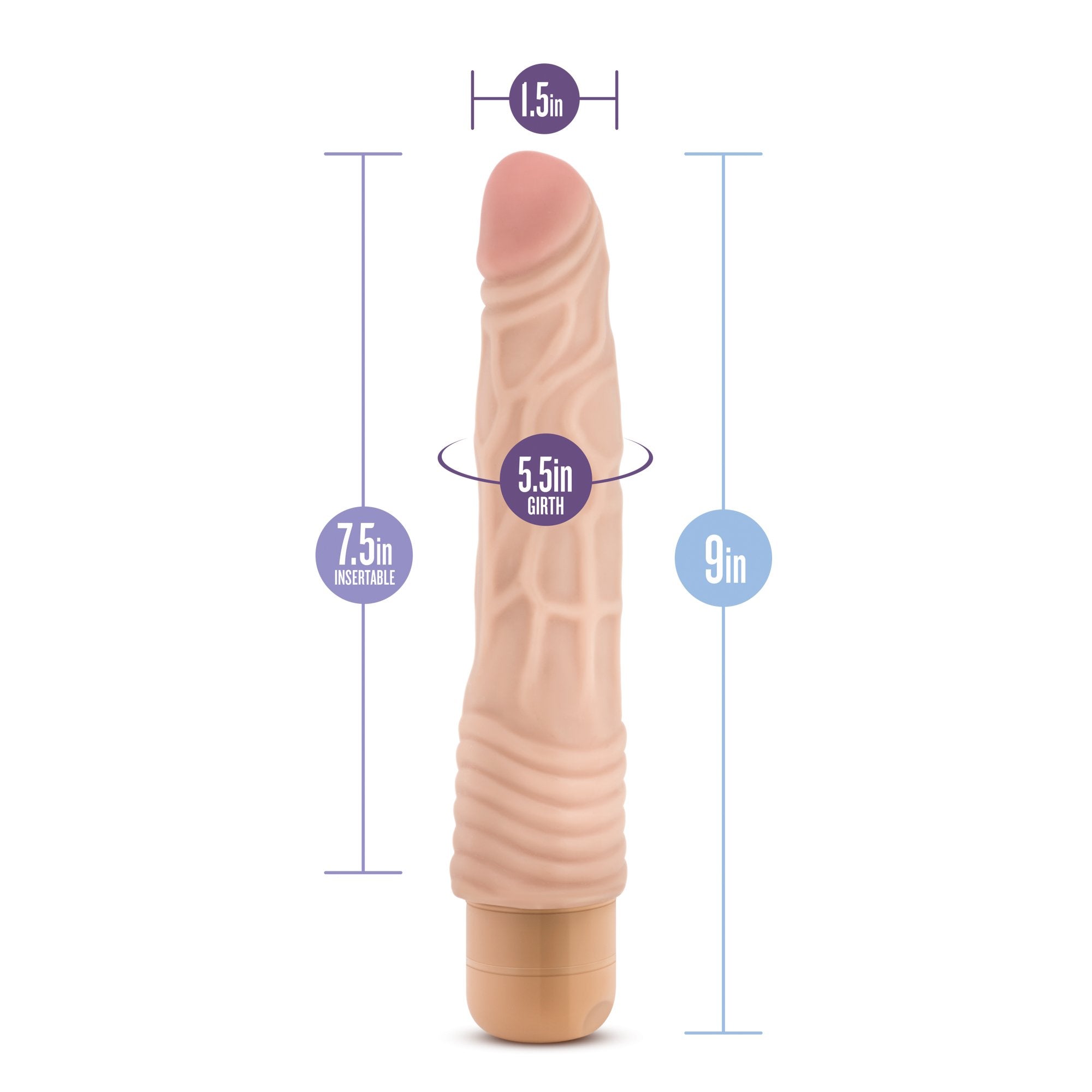 Q: What are the dimensions of the Blush Novelties Dr Skin Vibe 2?A: The Blush Novelties Dr Skin Vibe 2 measures 9 inches in total length, with an insertable length of 7.5 inches and a width of 1.5 inches.