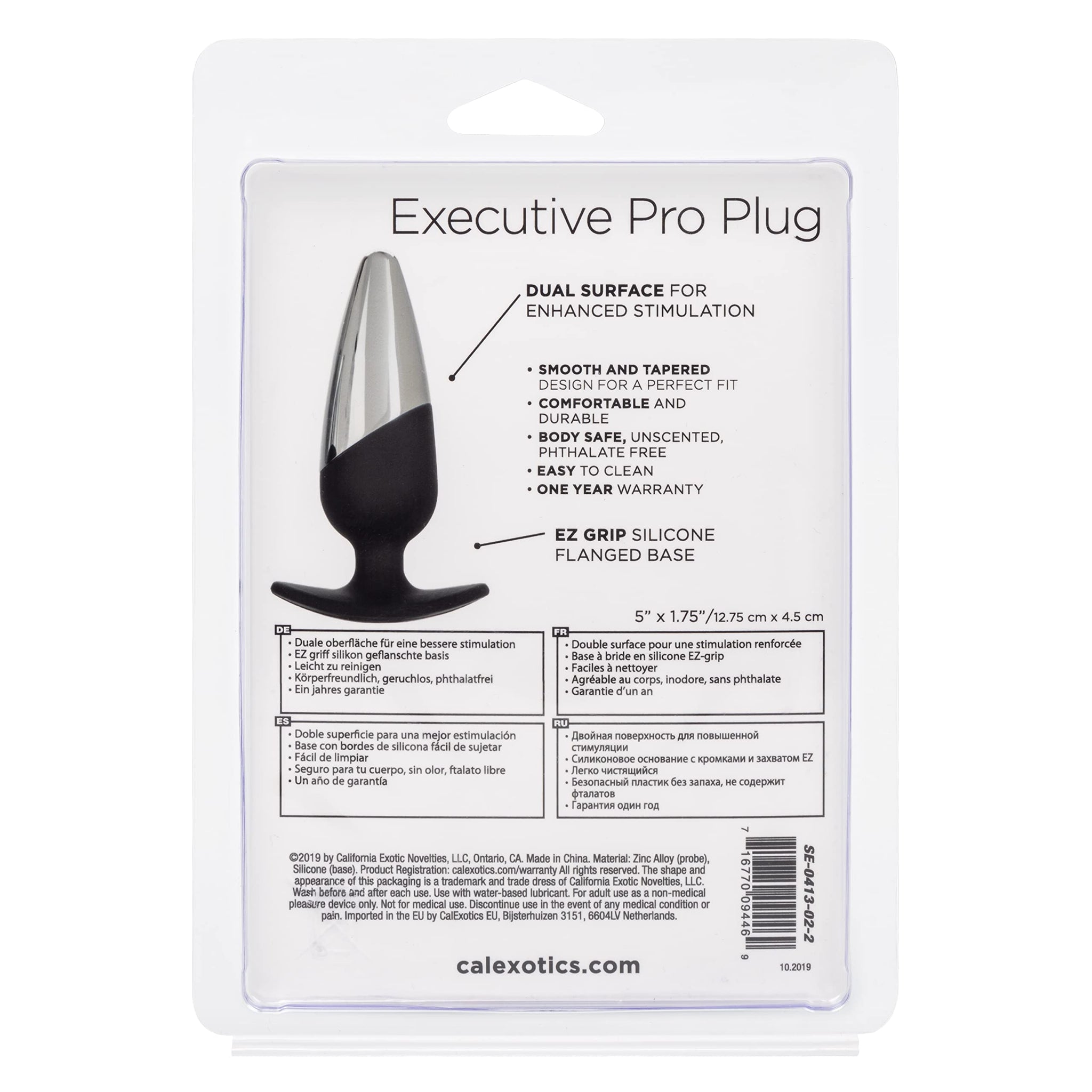 Q: What is the CalExotics Executive Pro Plug made from?A: The CalExotics Executive Pro Plug is made from body-safe silicone and nickel-free zinc alloy, ensuring safety and comfort during use.