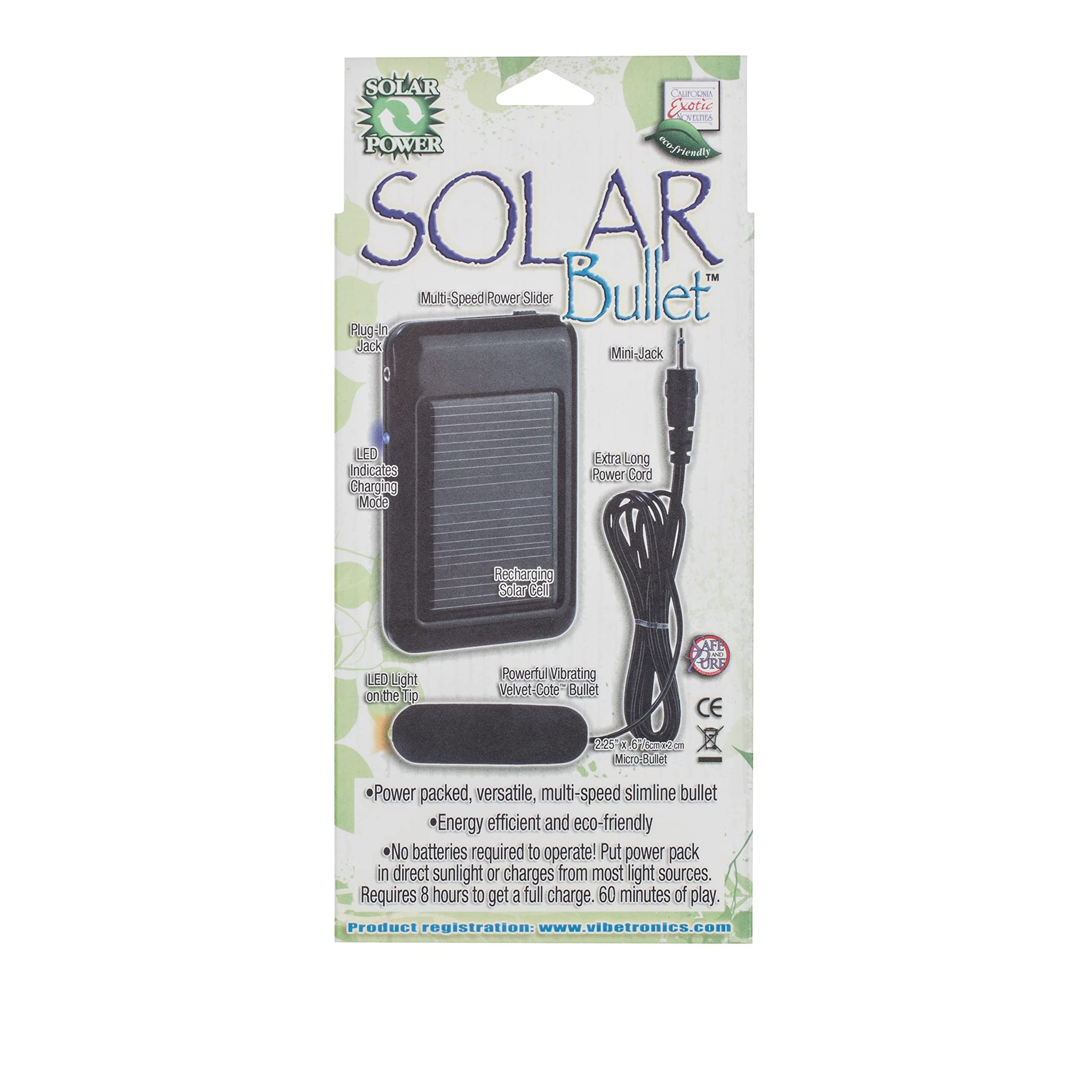Q: What is the California Exotic Novelties Solar Bullet?A: The California Exotic Novelties Solar Bullet is a rechargeable vibrating stimulator that operates using solar power, eliminating the need for batteries.