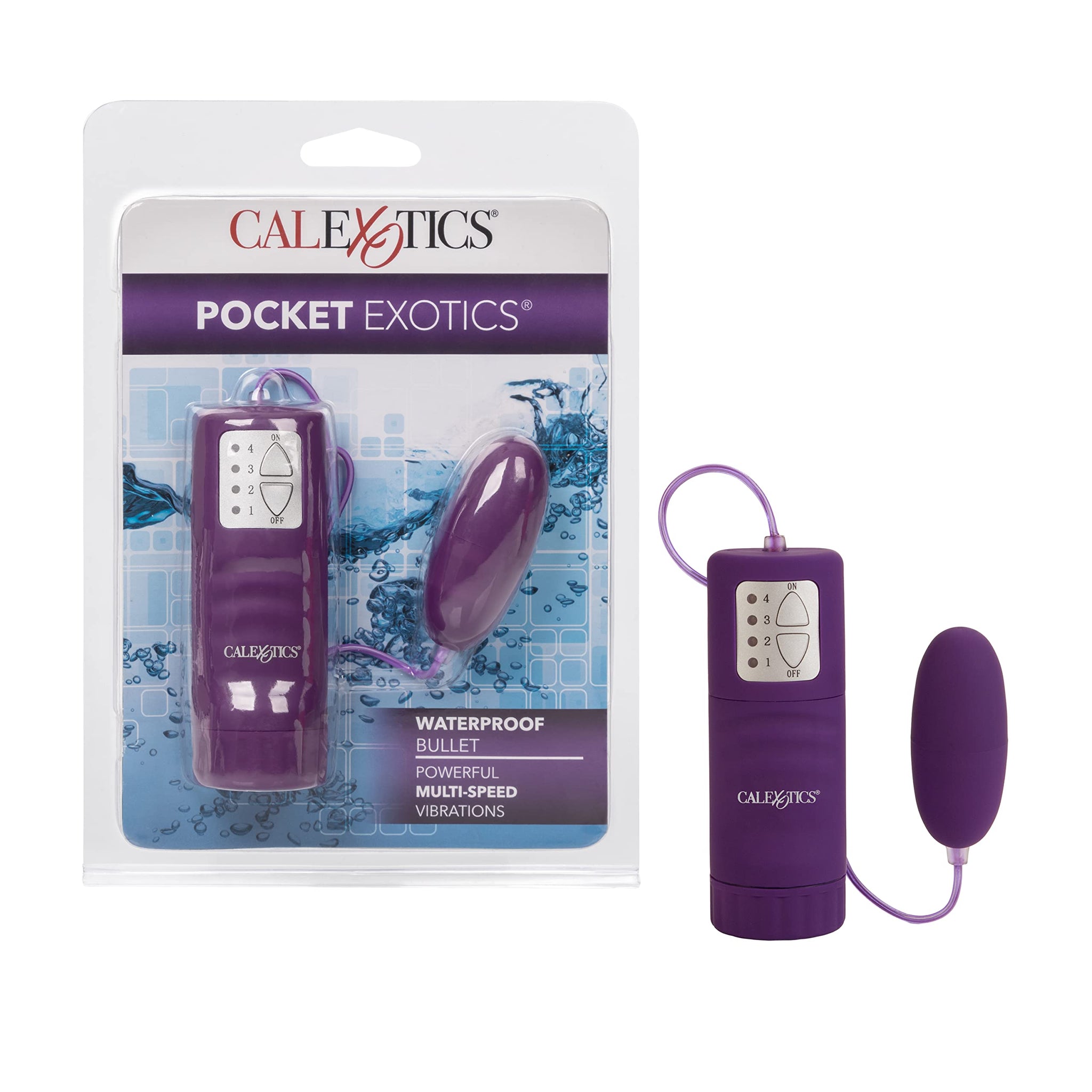 Q: What is the CalExotics Waterproof Pocket Exotics, Bullet Vibe?A: The CalExotics Waterproof Pocket Exotics is a compact bullet vibrator designed for targeted stimulation. It features a powerful motor with 4-speed settings and is made from ABS plastic with a polyurethane coat for a silky-smooth finish.