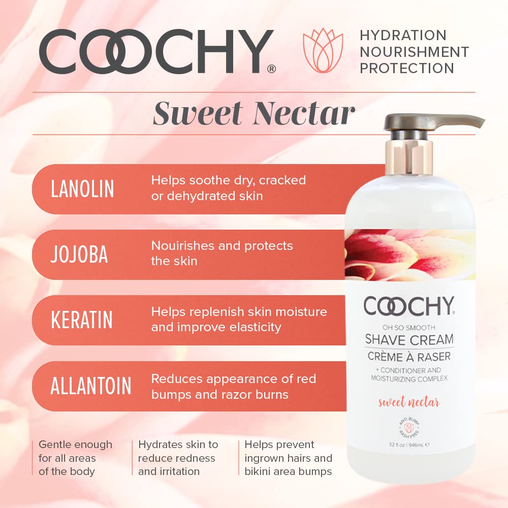 Coochy Shave Cream Sweet Nectar 32 ounces bottle from Classic Erotica. Rash free shave cream dramatically reduces cuts, nicks, scrapes and razor irritation. It contains a special conditioner and moisturizing complex that provides an effortless glide for a