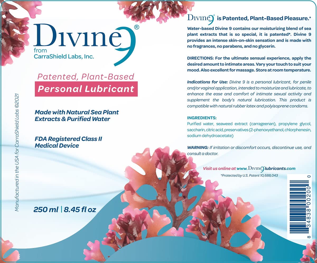 Divine 9 Water Based Lubricant 250ml e or approximately +8 ounces. Divine 9 Water Based Lubricant is a water based personal lubricant containing our proprietary blend of sea algae extracts. Divine 9 is so unique and special it has been granted a U.S. Pa