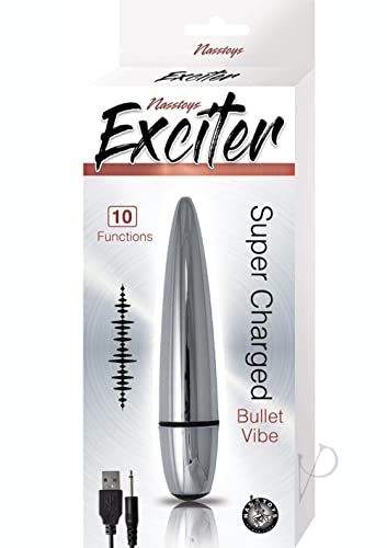 Q: What are the main features of the Nasstoys Exciter Super Charged Bullet Vibe?A: The Nasstoys Exciter Bullet Vibe features 10 functions, is super charged, water resistant, and made from phthalates-free ABS plastic. It has a length of 4.75 inches, a width of .875 inch, and a diameter of 2.75 inches.