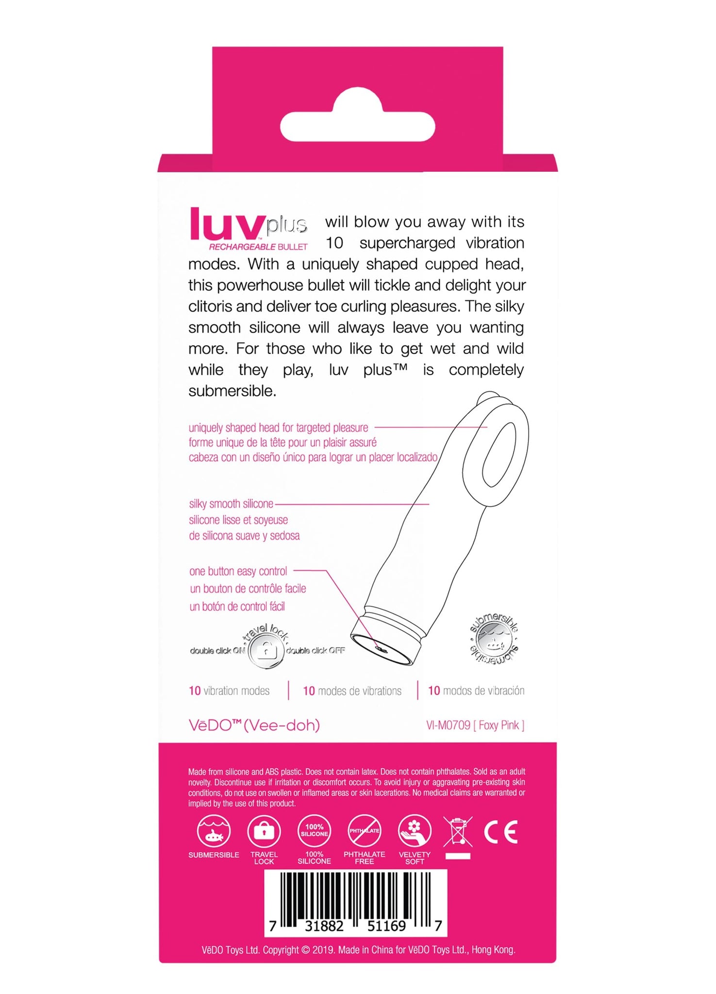 LUV plus rechargeable bullet will blow you away with its 10 supercharged vibration modes. With a uniquely shaped cupped head, this powerhouse bullet will tickle and delight your clitoris and deliver toe curling pleasures. The silky smooth silicone will al