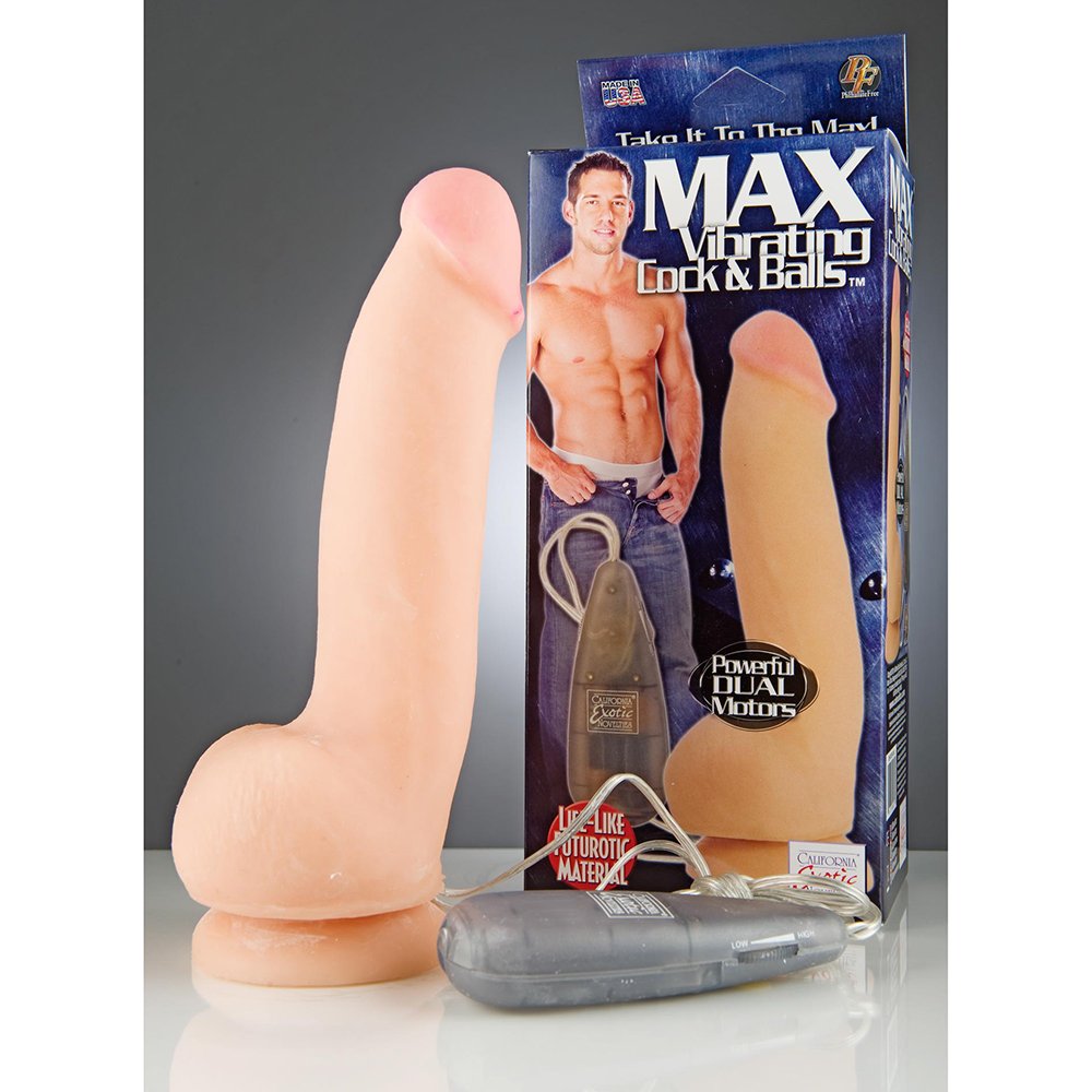 Max Vibrating Cock and Balls from California Exotic Novelties.Take your pleasure to the max with the Max Vibrating Cock and Balls, an orgasmic ride standing over 7 inches long with powerful dual vibrations to send you into a state of ecstasy. Measuring 6.